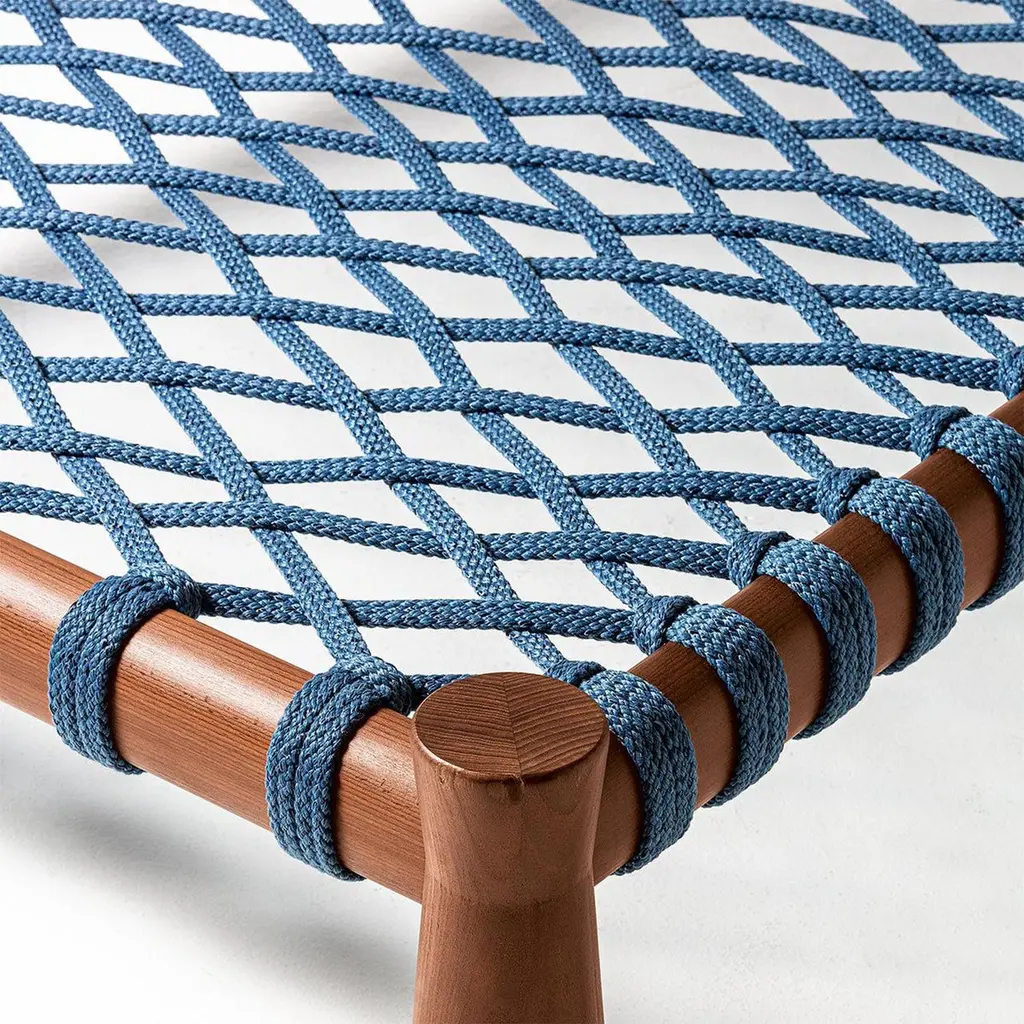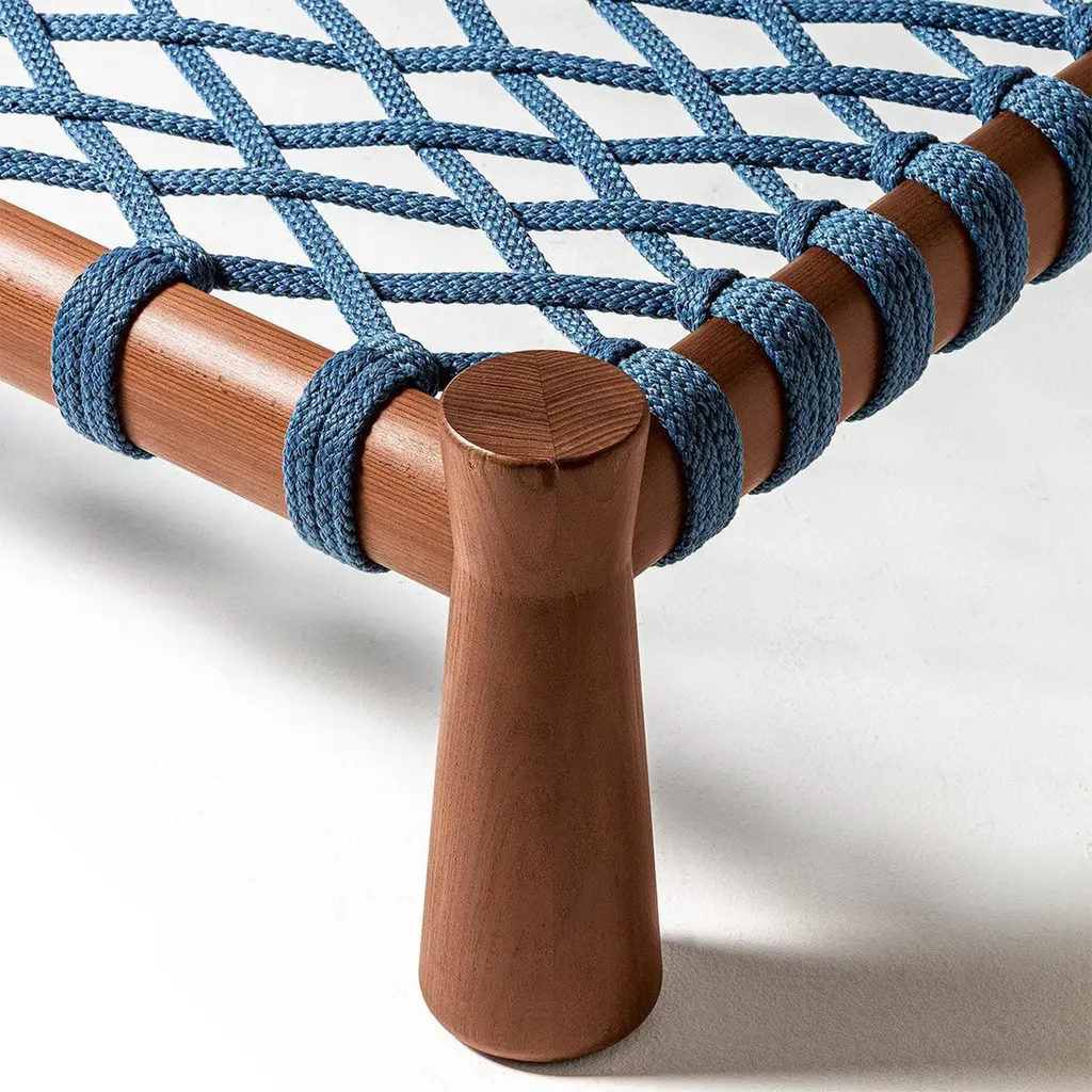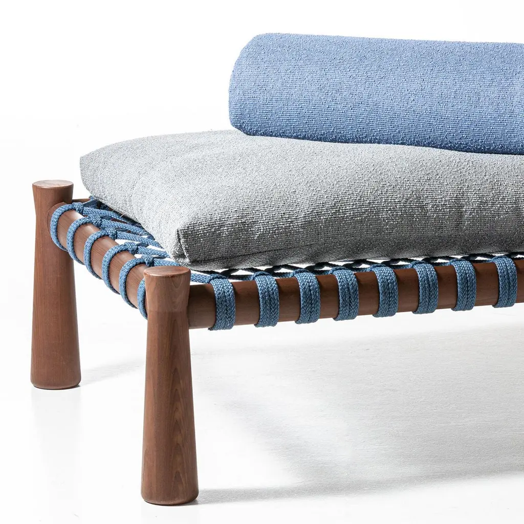 Pouf Ellaby Iroko with structure in solid iroko woodin oiled finish and with woven nautical rope in blue finish. With matress in L102xD79xH16cm with removable covering.Matress covered in outdoor fabric in Light Grey finish (Cat C.).Cushion included.