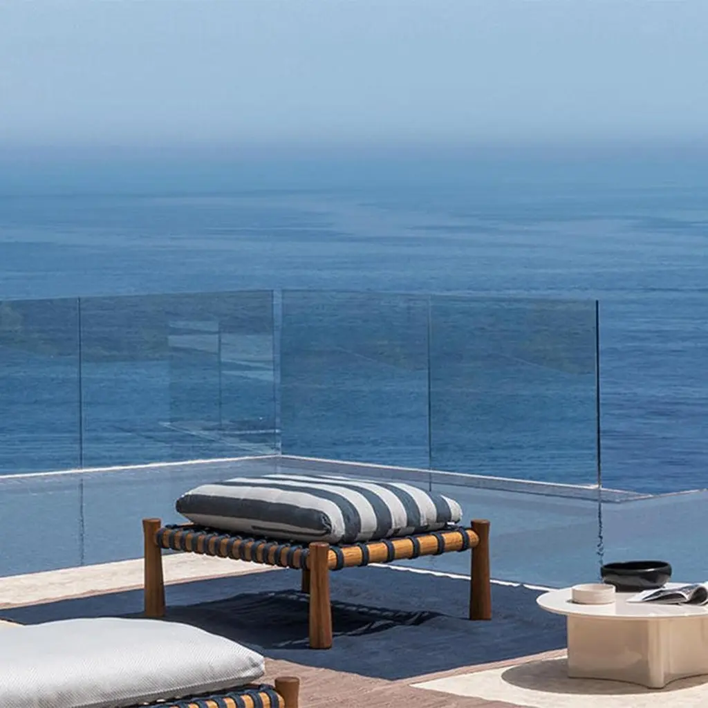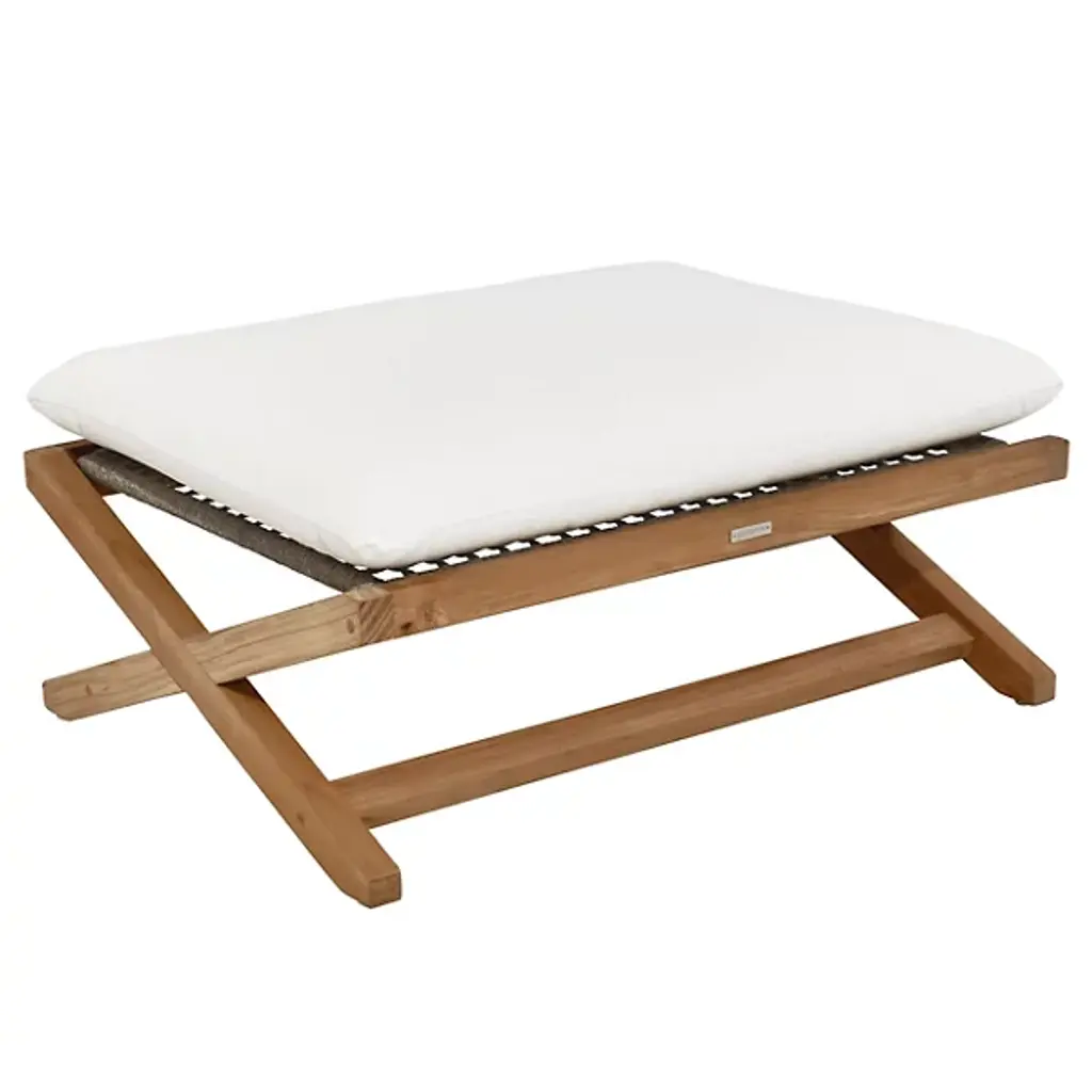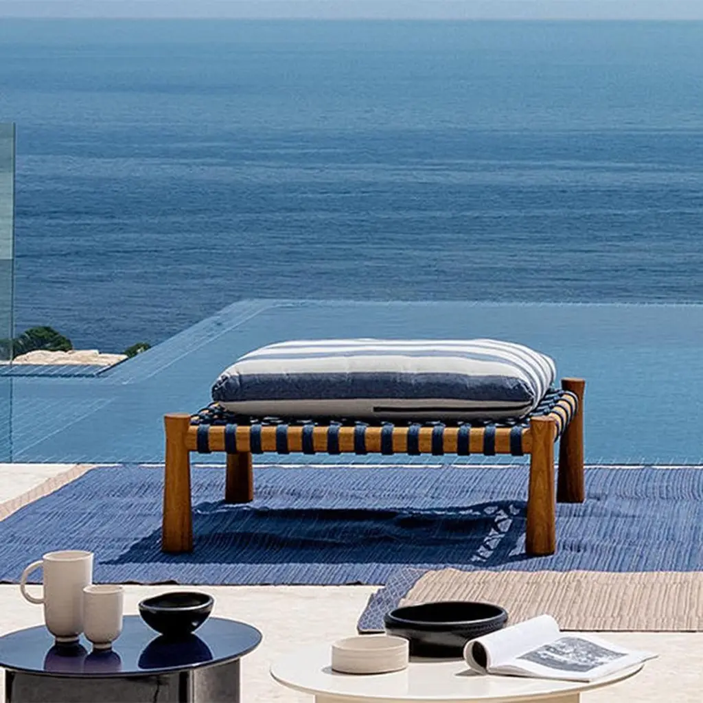 Pouf Ellaby Iroko with structure in solid iroko woodin oiled finish and with woven nautical rope in blue finish. With matress in L102xD79xH16cm with removable covering.Matress covered in outdoor fabric in Light Grey finish (Cat C.).Cushion included.
