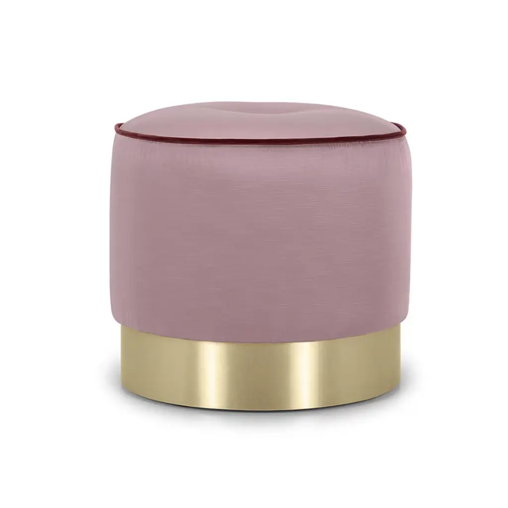 Glamorous and sophisticated, this cylindrical pouf evokes with its pink satin upholstery the alluring colors of the morning sky, a natural phenomeon represented by the goddess Eos in Greek mythology. A luminous laminate base enriched by a satin brass finish sustains the plush seat, whose upper profile is softly accented by a contrasting piping.
