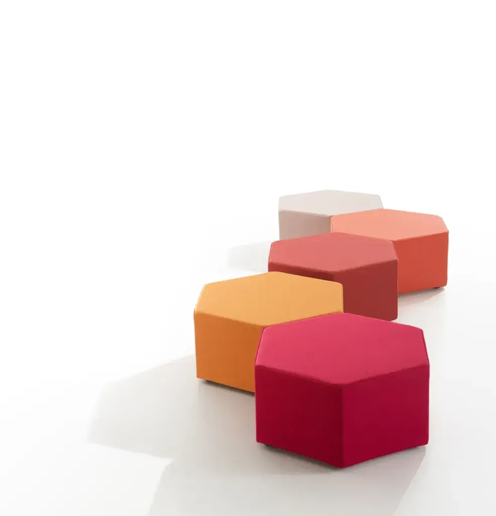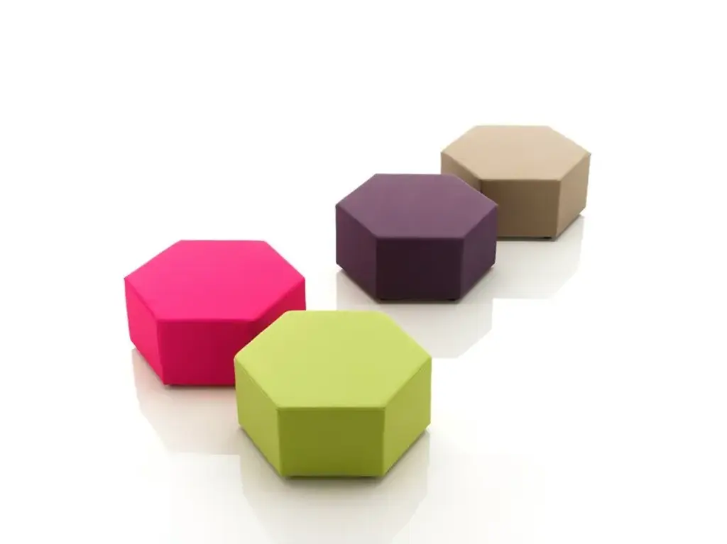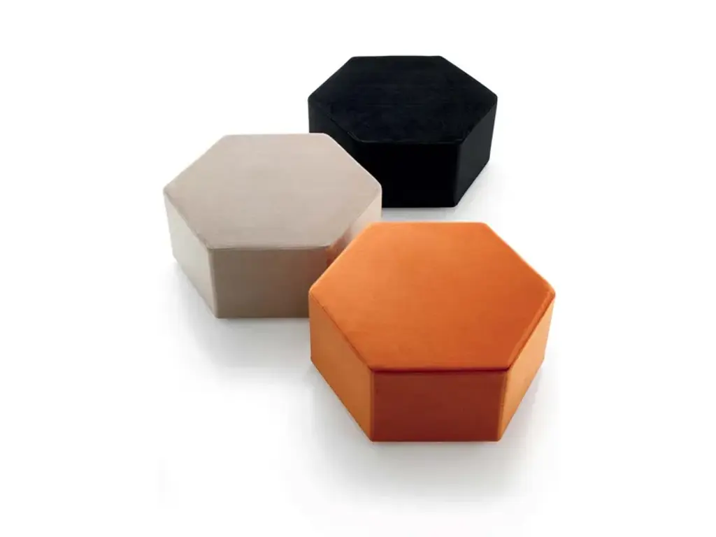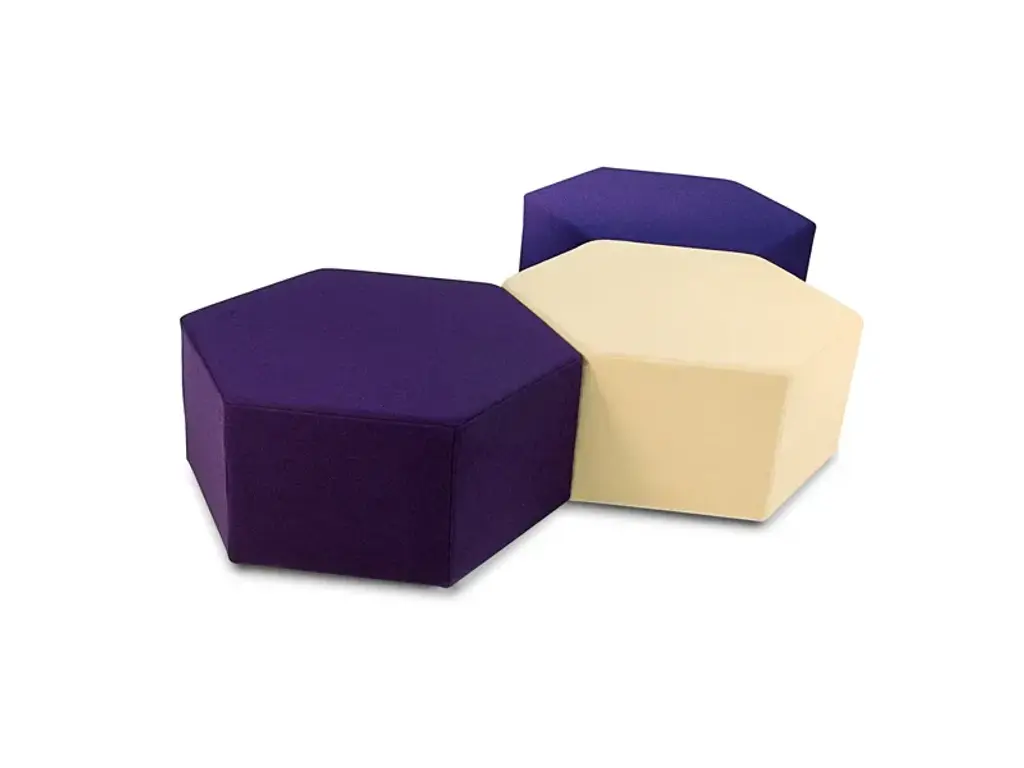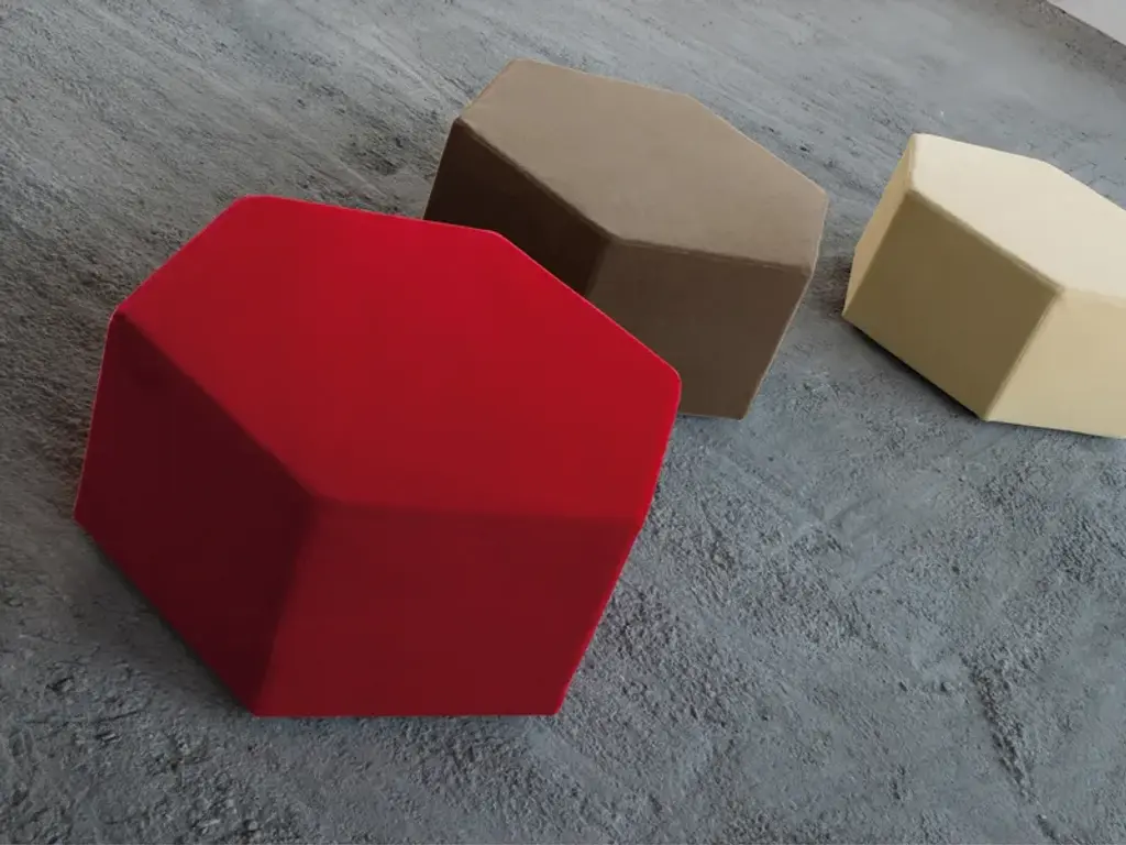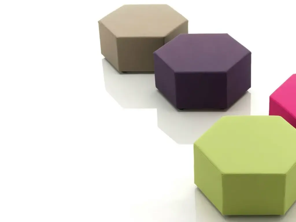 Esa - A hexagonal shaped geometric pouf that can be used to create a variety of different shape and colour arrangements by placing several elements together. The wooden base is padded with polyurethane foam and upholstered in fabric.