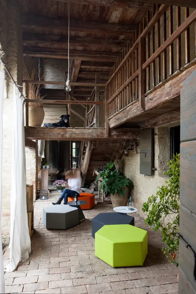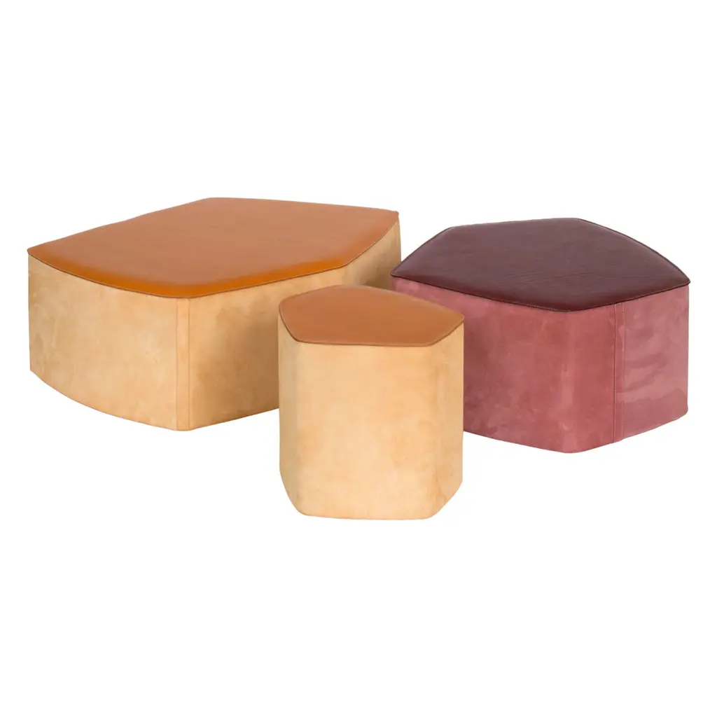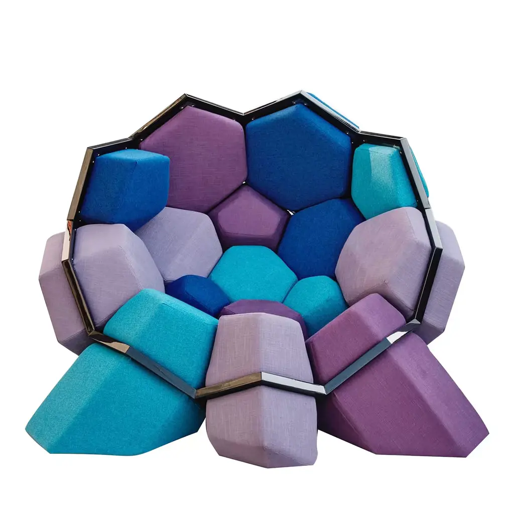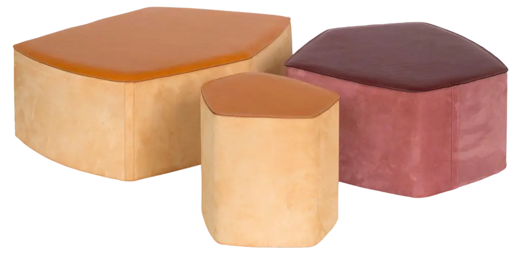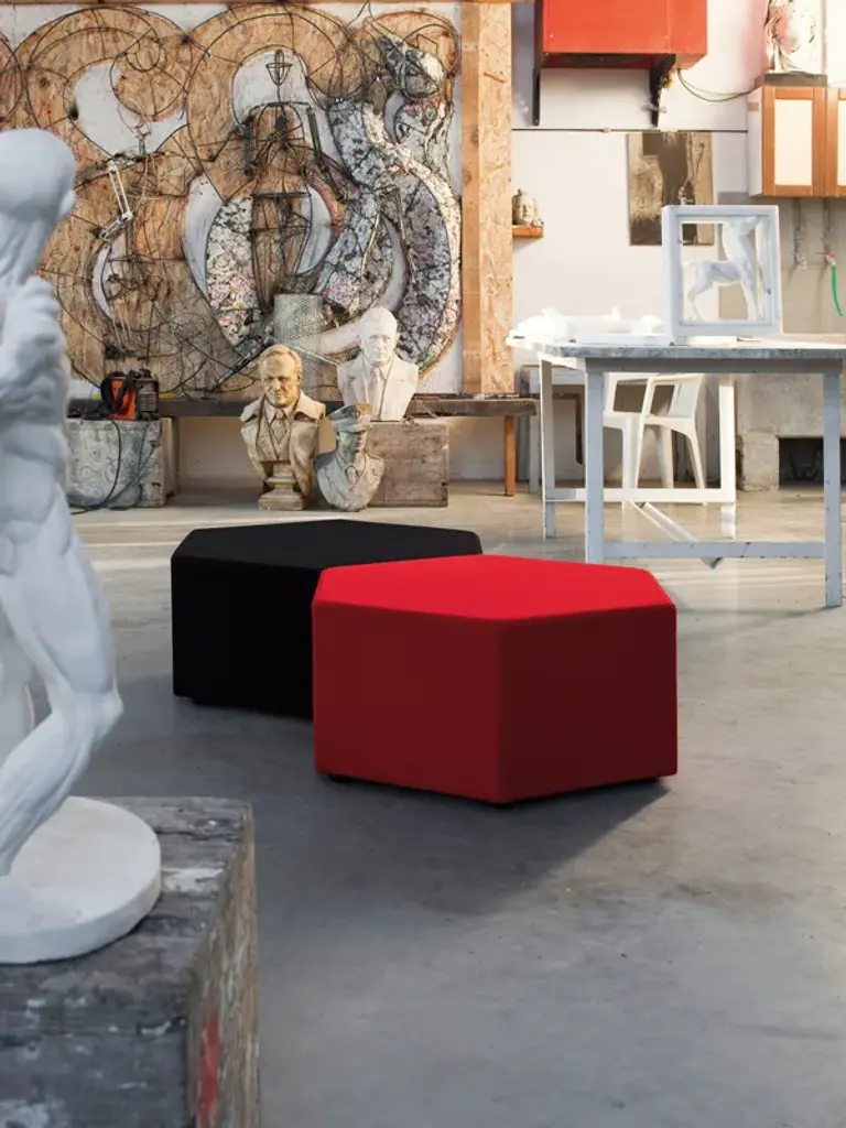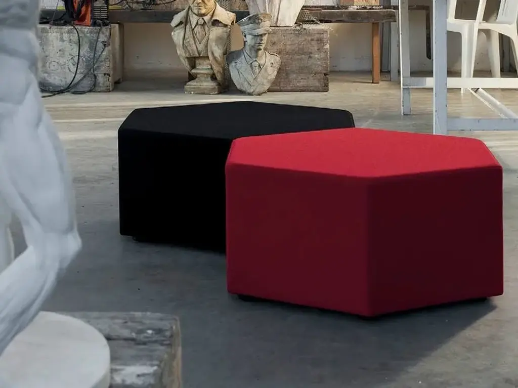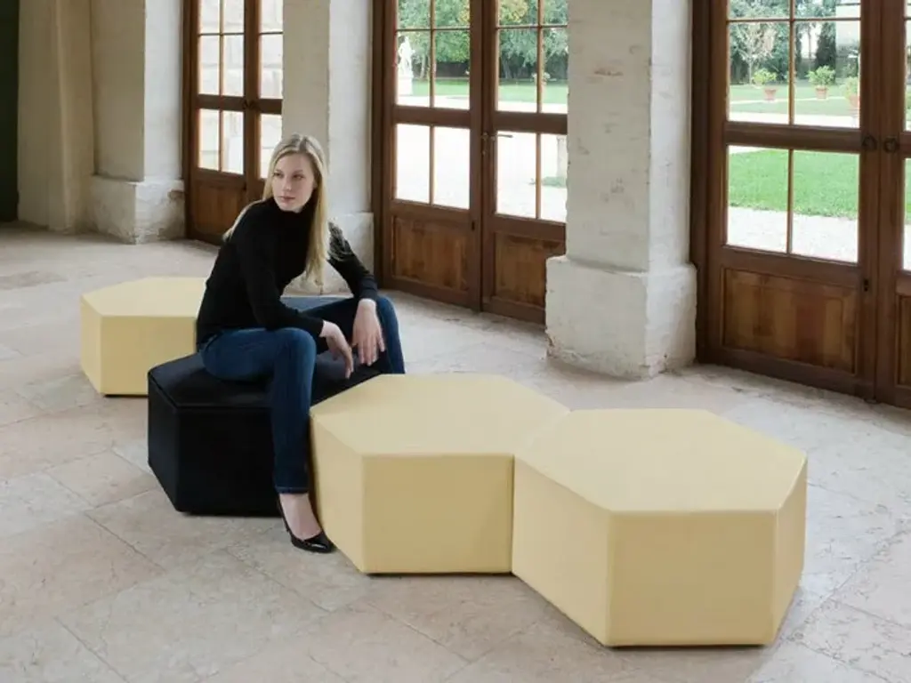 Esa - A hexagonal shaped geometric pouf that can be used to create a variety of different shape and colour arrangements by placing several elements together. The wooden base is padded with polyurethane foam and upholstered in fabric.