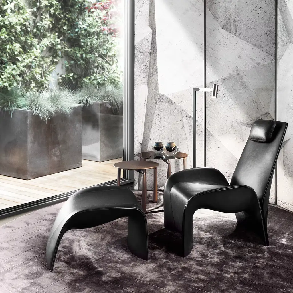 A must-have set of iconic designs to complement a contemporary living area with a bold and stately character, this armchair and matching pouf are among Giorgetti's signature pieces. Entirely upholstered with black leather, it showcases sinuous lines of contemporary flair, made of compact and rigid polyurethane, padded on specific sites with flexible, cold-foamed polyurethane covered with fiber. Please ask the Concierge for customization options.