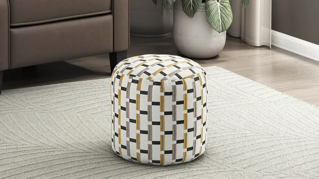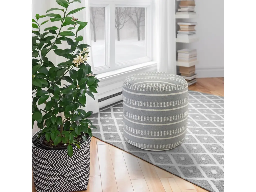 Whether the Findlay Pouf serves to provide stylish accent to your home's decor, convenient seating when the need arises, or as perfect place to put up your feet, the cylindrical accent pouf's versatility of purpose makes it a convenient addition to your space. The pouf is covered in a linear multi-hued jacquard fabric upholstery.
