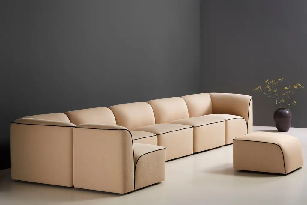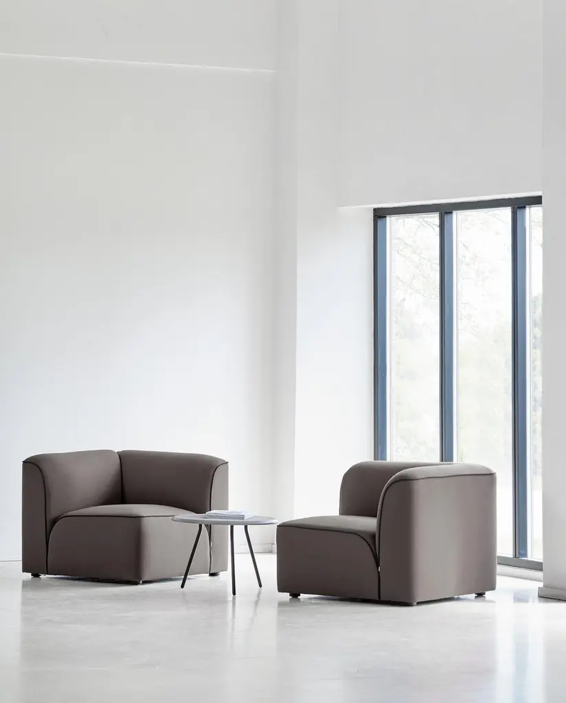 Flora Pouf by Yonoh.Materials: Plywood, foam, webbing, wood, fabric (Kvadrat Vidar 0323).Dimensions: D 66 x W 70 x H 43 cm.Also available in different colours and materials.The founders, Mia and Torben Koed, decided to put their 30 years of experience into a new project. It was time for a change and a new challenge. The challenge was to build an ambitious design brand from the ground up with high-quality materials and great attention to the little details. With a drive to create new originals, the WOUD collection is founded upon the idea to look ahead instead of looking back and share the love for honest design. Therefore, we are eager to discover and develop new ideas whether it being in form, function or choice of material. Yonoh is a creative studio based in Valencia, Spain, founded by Clara del Portillo and Alex Selma in 2006. Both industrial designers by training. The two met as young designers at an exhibition in 2004 and at the end of 2006, they could present their first collection together as Yonoh. The studio is characterized by its simple and functional designs. With this combination, they aim to create innovative and original designs. Their versatility, timelessness and adaptability are the cornerstones of the work done in their studio. In order to share their clear envision, they give lectures and workshops around the world promoting the Yonoh way of work. Yonoh believes that the best designs are those that make an object simple and natural. The Flora modular sofa is inspired by the natural shapes of vegetation. Together with its soft and voluminous shapes, Flora is designed to compose perfectly while staying organic and soft shaped.