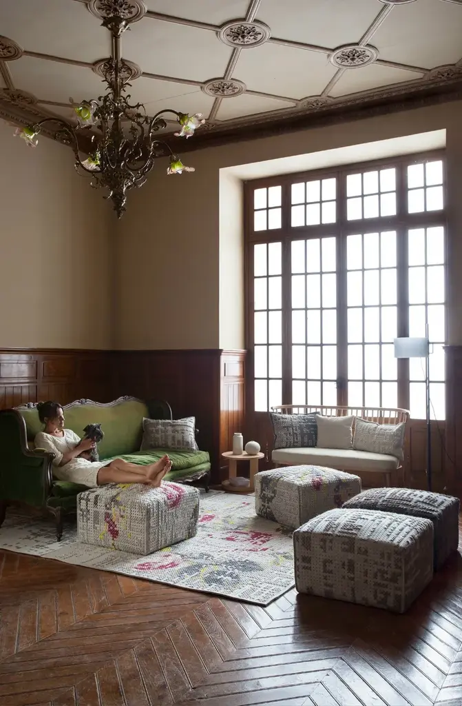 FLOWERS NATURAL: 100% Wool. Filling foam rubber or polystyrene. 60x60x35h cm - 24”x24”x14”h.Fibre composition: 100% new wool. Filling: Wood frame and 30 kg foam rubber. Charlotte Lancelot revisits a classic technique: a cross, a pixel. Carpets, poufs and cushions made using a perforated soft felt base with interwoven threads of wool in a range of colours.