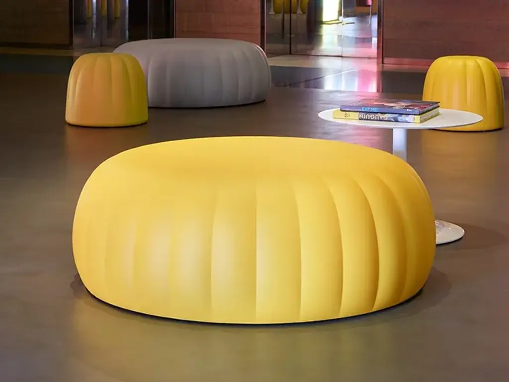 Gelée Grand soft pouf is the bigger item of the Gelée collection, inspired by the jelly candies, once loved by all kids. Made in soft polyurethane, Gelée Grand just needs one glance to be magnetically kidnapped, with the desire to try it out, ready to taste the comfort and softness: an original object that integrates beauty, entertainment and technology in a perfect mix that makes it ideal for contract projects and domestic spaces, both indoor and outdoor. Gelée Grand is a really soft and comfortable pouf, but very resistant thanks to its metal internal body; moreover, it is waterproof, fireproof, easy to clean.
