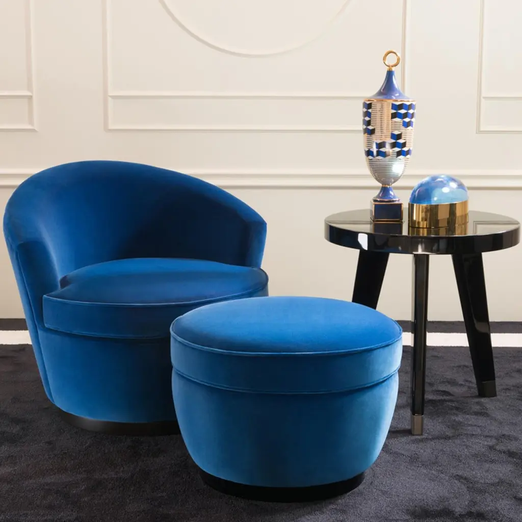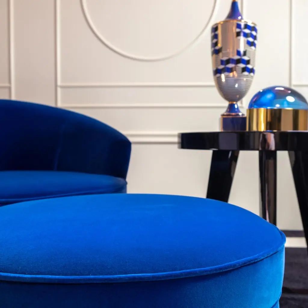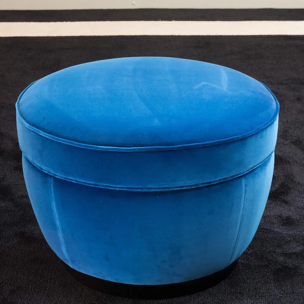 Designed by Domenico Mula as matching accessory for the Georgette Armchair, this pouf's retro-inspired look will fit elegantly in both classic and modern interiors. The round shape showcases a plush velvet fabric cover in cobalt blue with vertical seams around the base that highlight the sinuous silhouette. A versatile and elegant piece that can be used as a footrest and occasional table in a modern living room or seat for a vanity desk in a bedroom, this pouf has a round, hidden base crafted of wood with a matte or glossy lacquered finish. Contract and commercial certifications available upon request.
