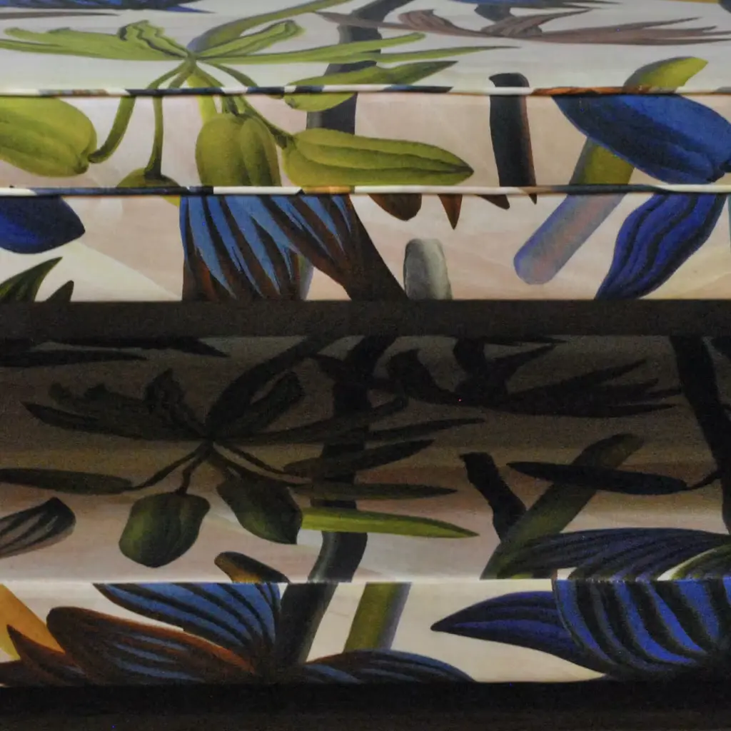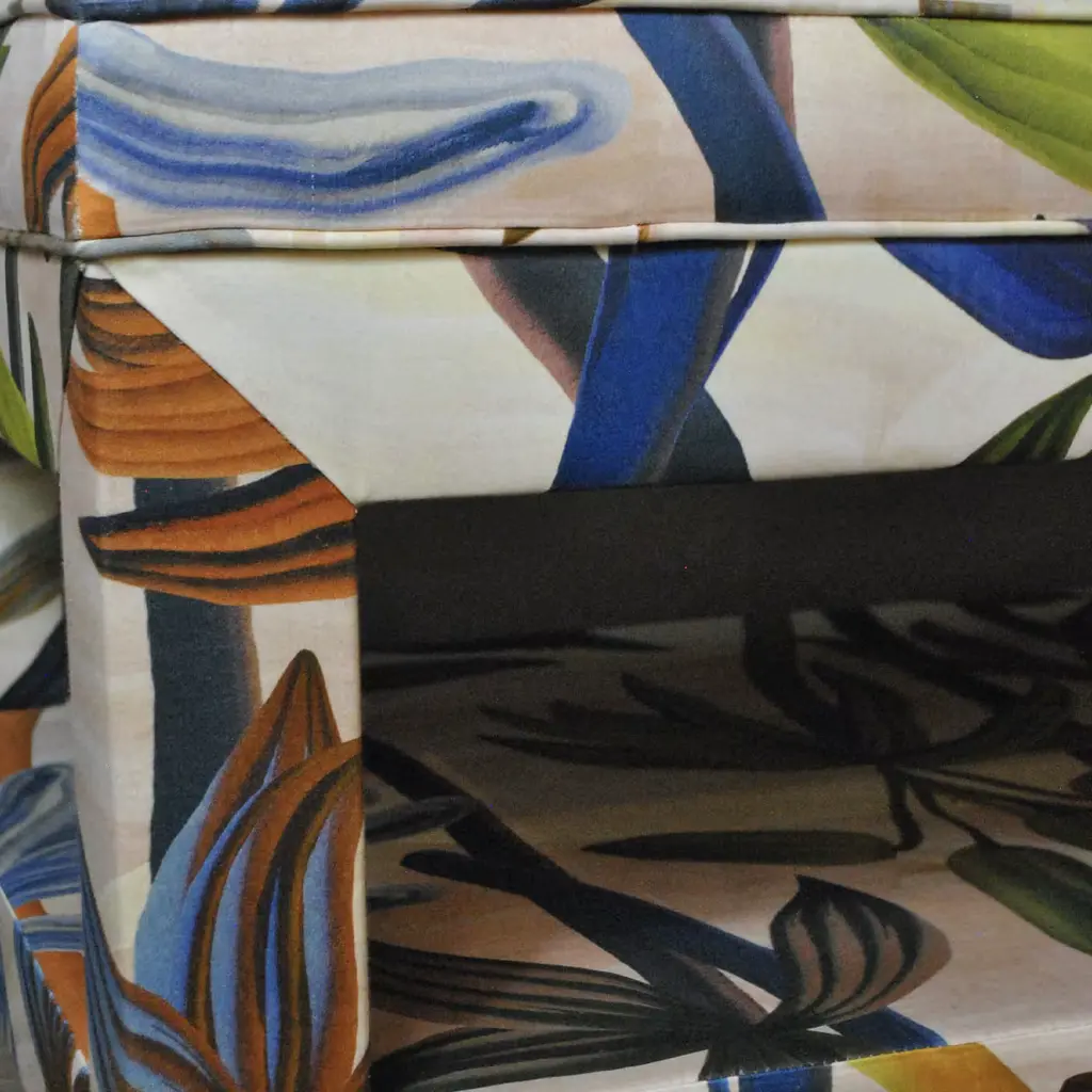 Versatile and visually striking, this bench features a square frame with both upper and lower platforms, supported by four sturdy legs. Constructed with a wooden core softened by polyurethane, it’s enveloped in a designer textile showcasing oversized, vibrantly colored leaves. Functional as a seat, footrest, or side table, it brings a touch of nature indoors with its bold and refreshing print, creating a centerpiece for dynamic living spaces.