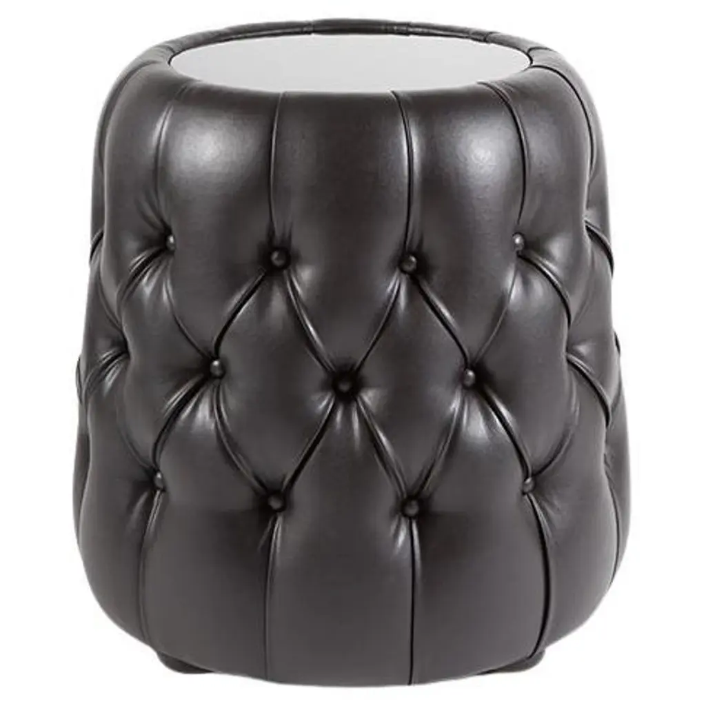 This elegant and comfortable seat updates the 18th century French archetype with contemporary details. The drum frame is made of wood and upholstered entirely with soft velvet in a sophisticated teal color, with a smooth round pillow on top and capitonne' style with tone-on-tone buttons around the lower section. The base is in mocha-lacquered wood and is raised on pointed feet. The ideal choice to infuse elegance and glamour into a luxurious bedroom decor, this exclusive pouf can be paired with the Annette vanity table for a striking look.