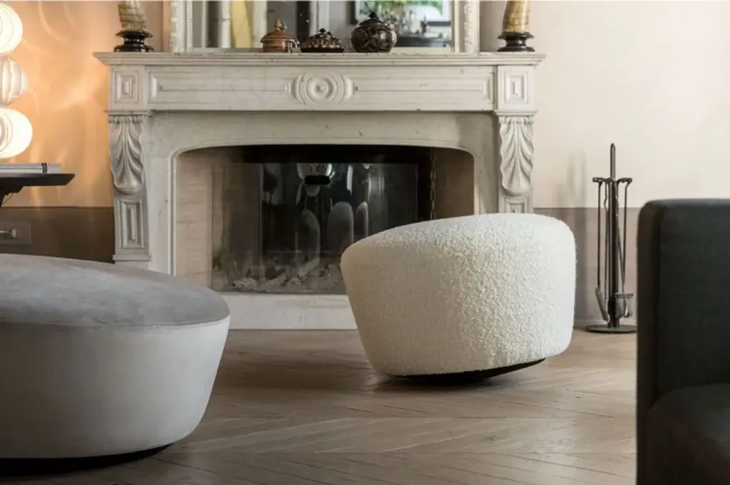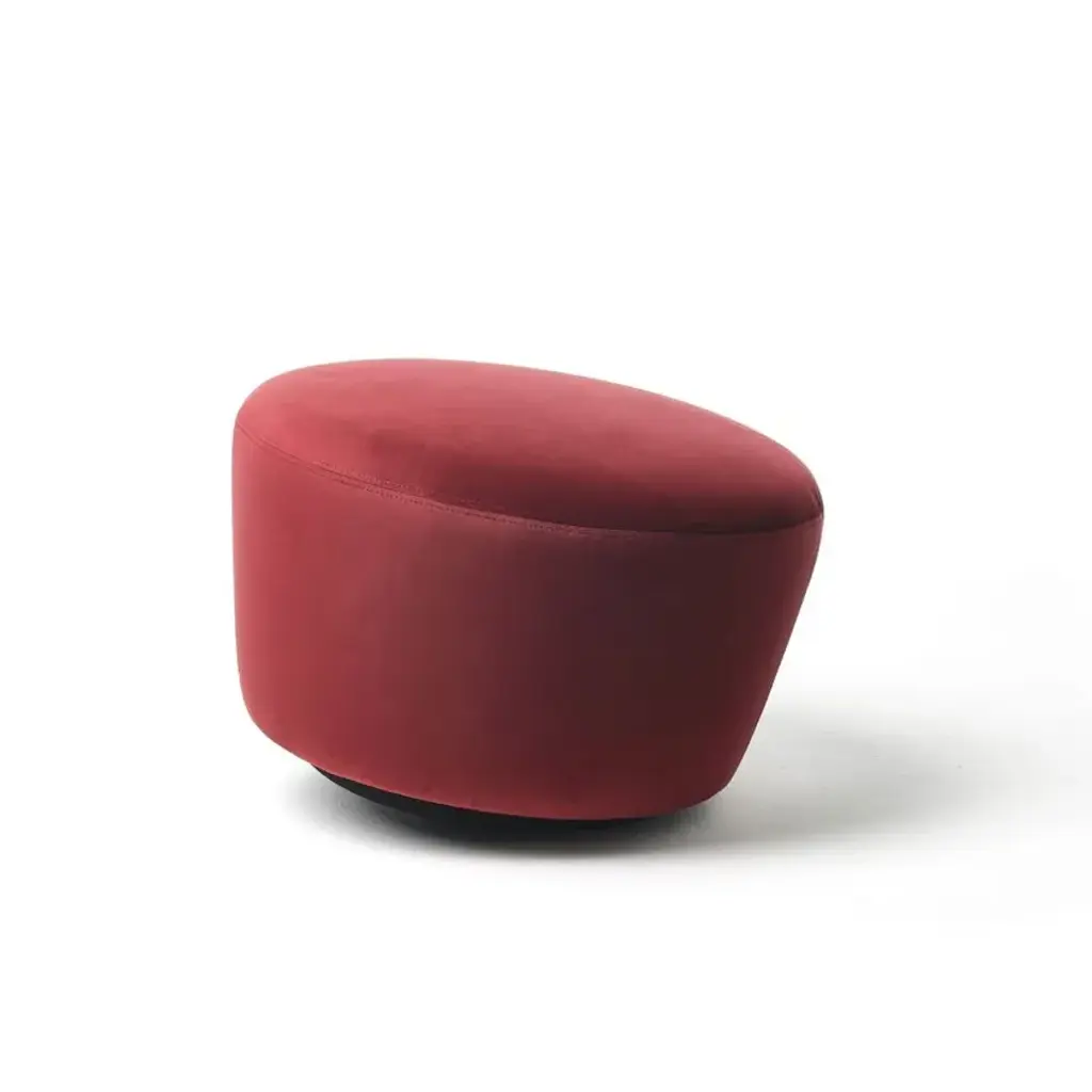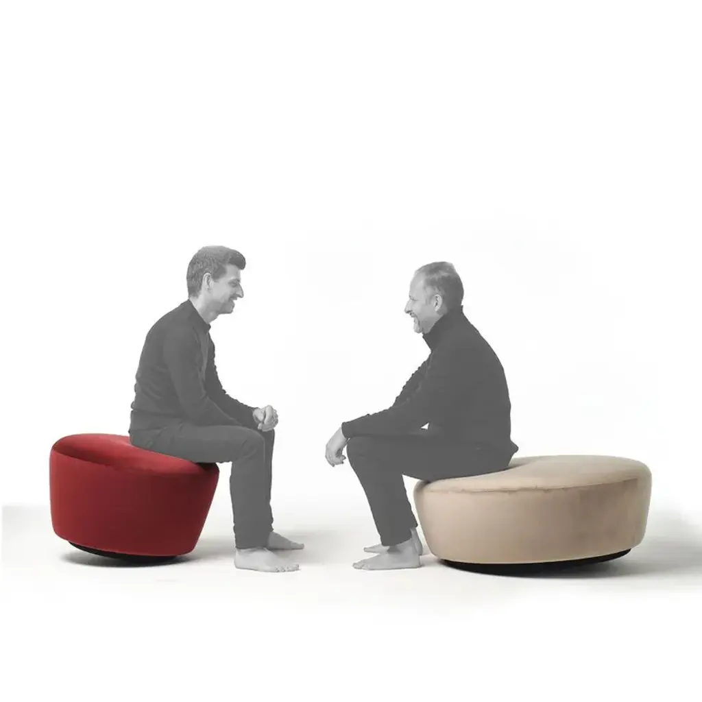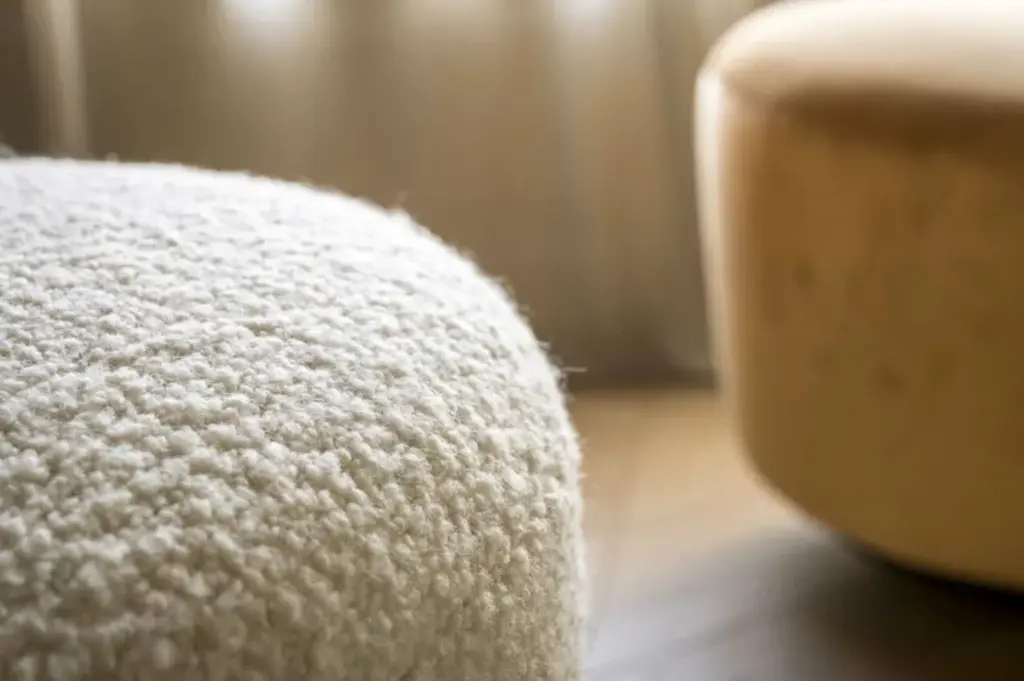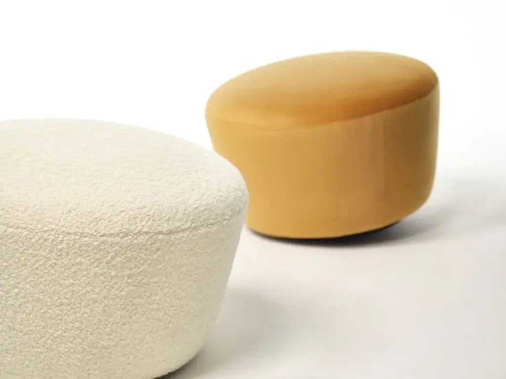 Gigio e Gigione are upholstered floating poufs, non-removable. The base is made of turned beech wood, covered in noise-reducing and scratch-resistant fabric. The conical shape of the base allows for gentle rocking. The upholstery is available in velvet colors from our sample collection or in bouclé.