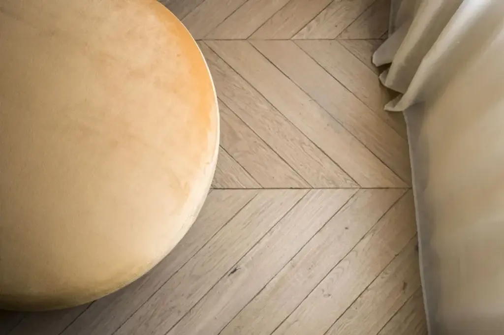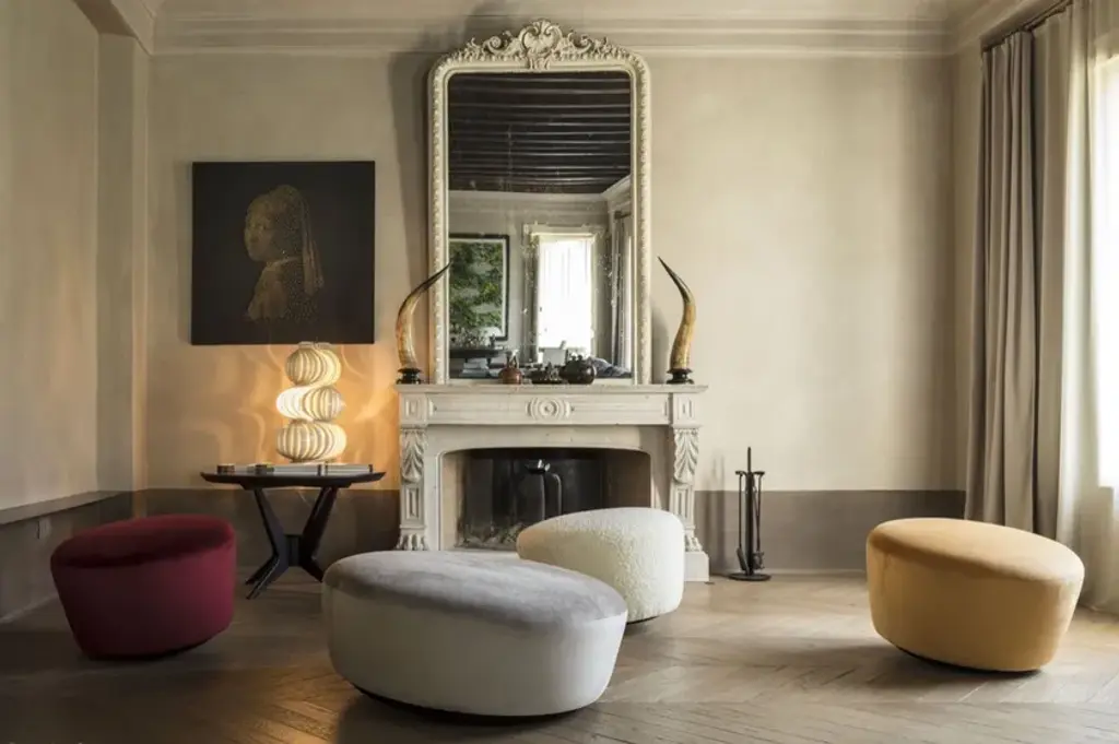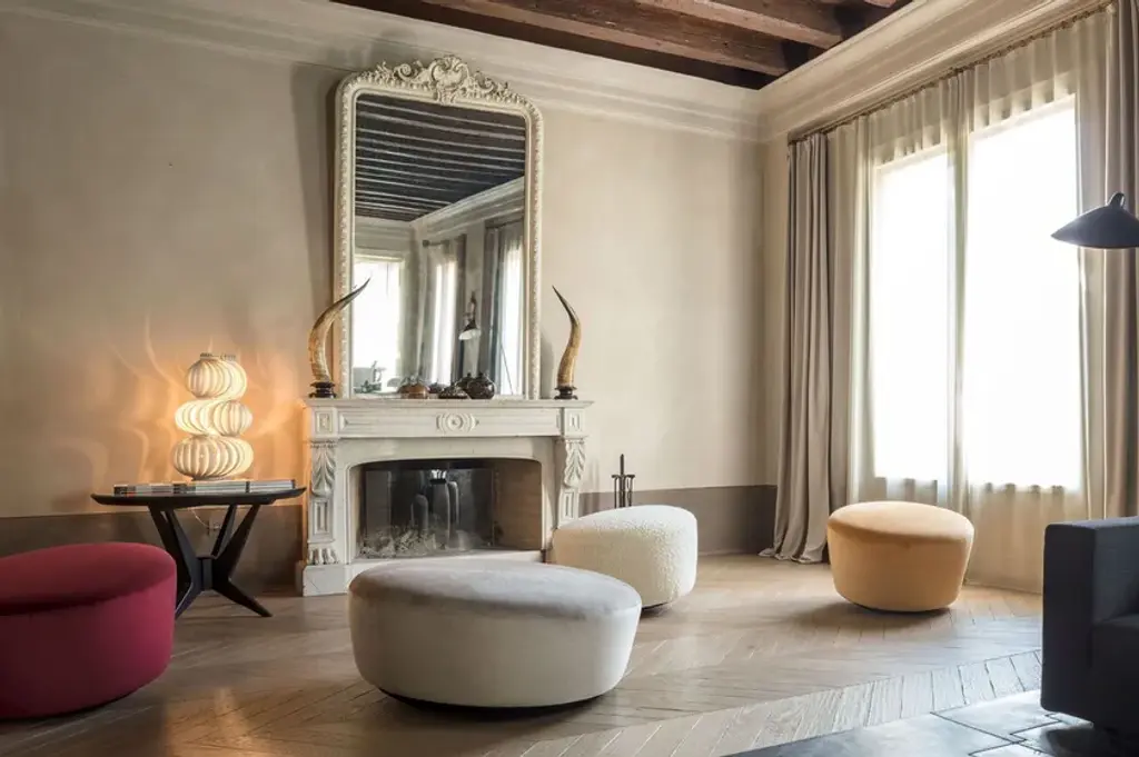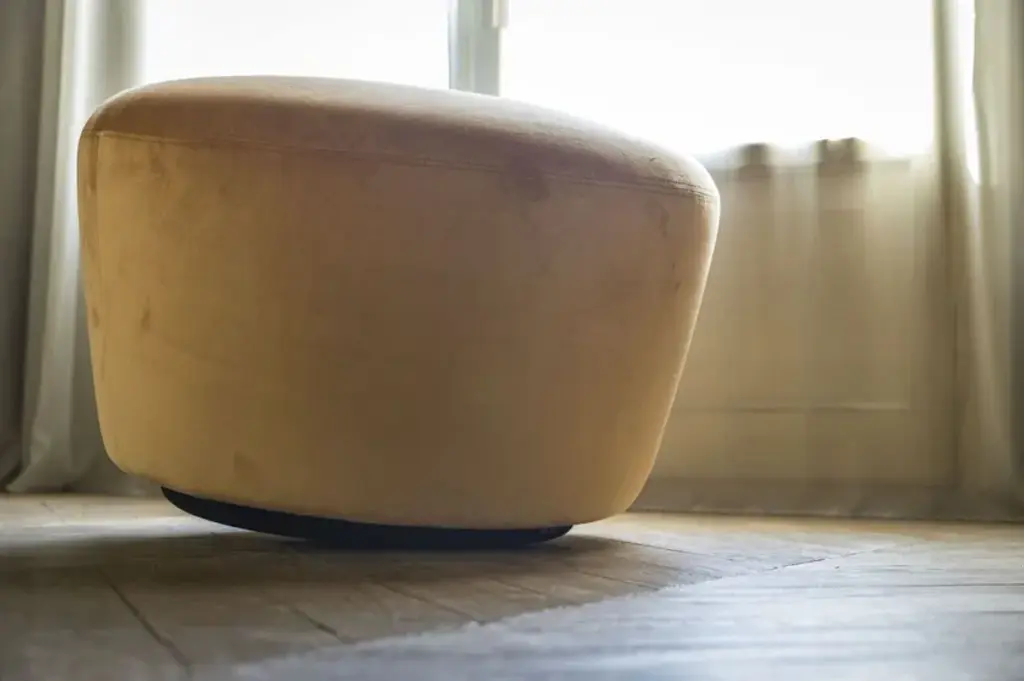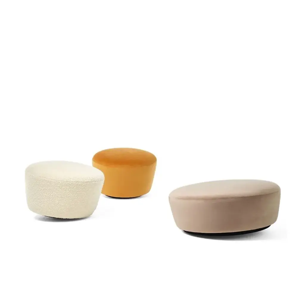 Gigio e Gigione are upholstered floating poufs, non-removable. The base is made of turned beech wood, covered in noise-reducing and scratch-resistant fabric. The conical shape of the base allows for gentle rocking. The upholstery is available in velvet colors from our sample collection or in bouclé.