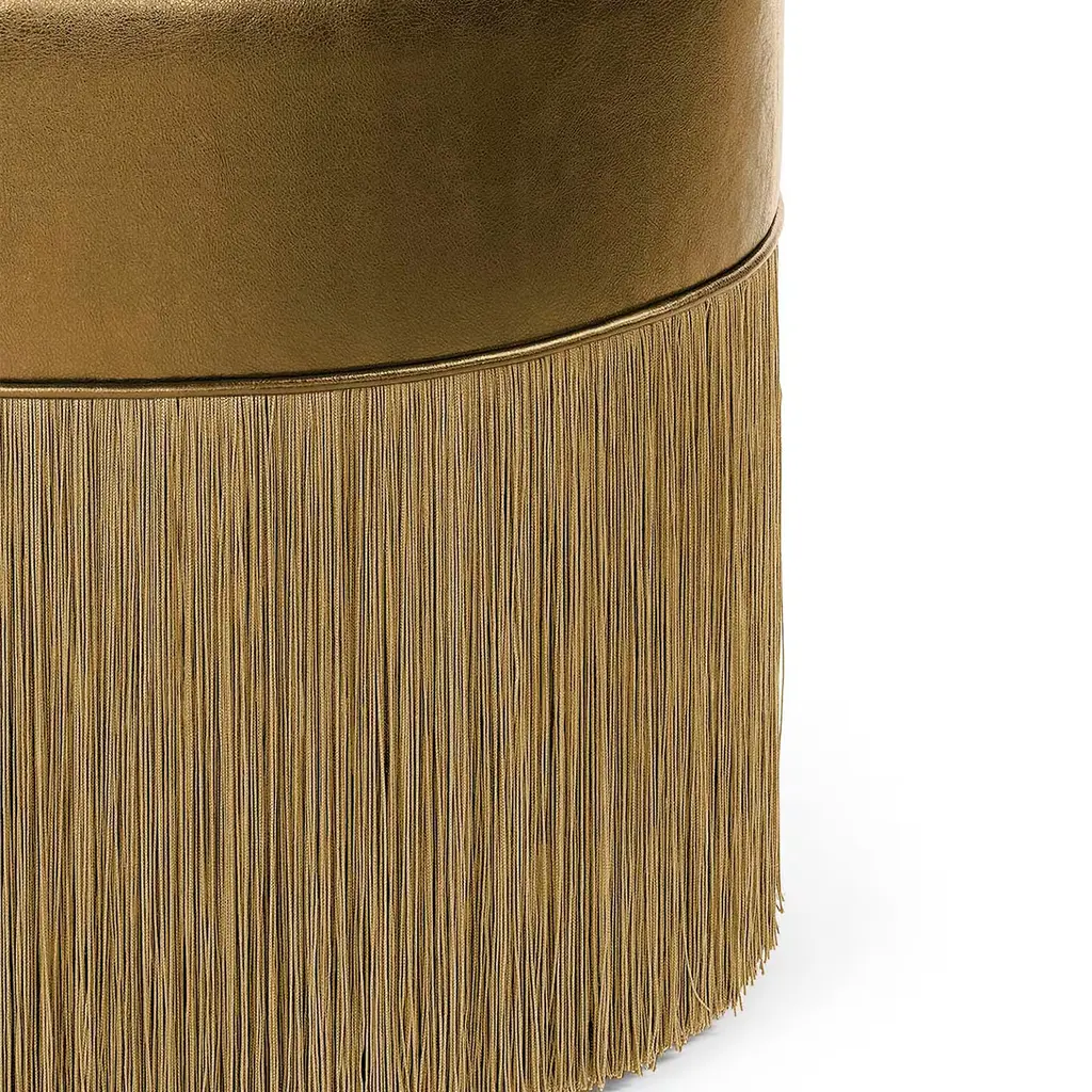 The Plissé Bronze Leather Pouf is an elegant and sophisticated addition to any space. With a diameter of 50 cm (19.7 inches) and a height of 46 cm (18.1 inches), this pouf blends comfort and luxury seamlessly. Upholstered in luxurious bronze leather, it exudes timeless elegance with its rich, metallic sheen. The distinctive Plissé pattern adds dynamic texture and depth, while the overlapping fringe motif creates a sense of movement and lightness. Its sleek, metallic finish is complemented by subtle tone-on-tone fringes, enhancing the pouf's refined and versatile design. Ideal for both modern and classic interiors, the Plissé Bronze Leather Pouf is perfect as an extra seating option, a chic footrest, or a decorative accent. Each bespoke piece is stamped on the bottom of the pouf’s lining and personally signed, numbered, and dated by designer.