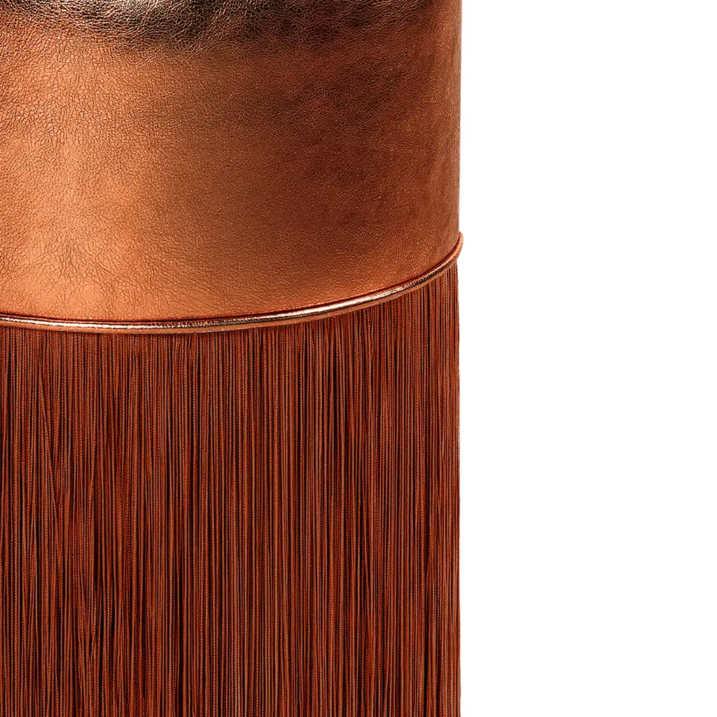 The Gleaming collection by Lorenza Bozzoli Couture shines in its own light and captures attention with its lustrous allure. The seatings of the signature fringed poufs have been enveloped into foil-finished leather glossy and radiant, carefully selected in different hues. The iconic fringes are proposed in copper. The Gleaming collection it’s a fusion of futuristic luxury and timeless design, creating a balance between classic elegance and avant-garde aesthetics. Each bespoke piece is stamped on the bottom of the pouf’s lining and personally signed, numbered, and dated by designer.