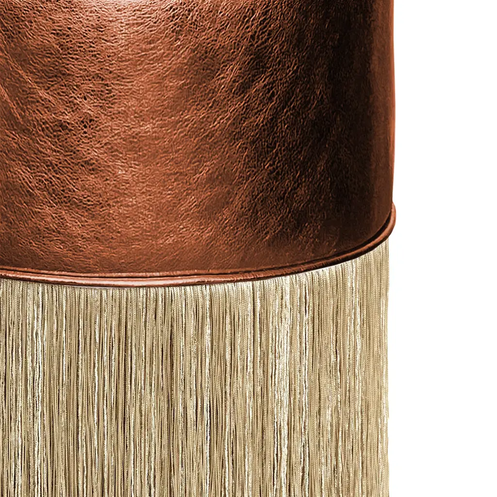 The Gleaming collection by Lorenza Bozzoli Couture shines in its own light and captures attention with its lustrous allure. The seatings of the signature fringed poufs have been enveloped into foil-finished leather glossy and radiant, carefully selected in different hues. The iconic fringes are proposed in gold. The Gleaming collection it’s a fusion of futuristic luxury and timeless design, creating a balance between classic elegance and avant-garde aesthetics. Each bespoke piece is stamped on the bottom of the pouf’s lining and personally signed, numbered, and dated by designer.