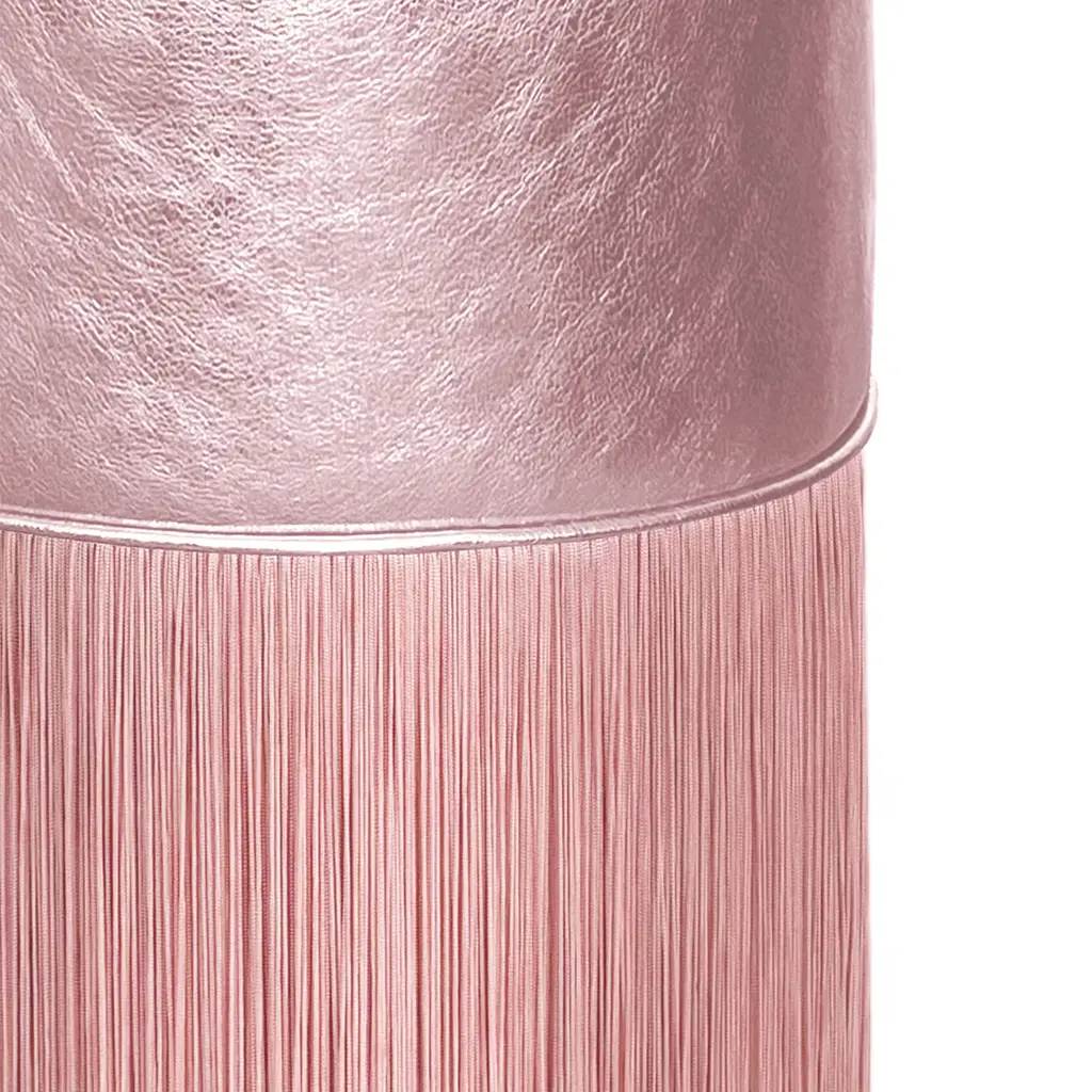 The Gleaming collection by Lorenza Bozzoli Couture shines in its own light and captures attention with its lustrous allure. The seatings of the signature fringed poufs have been enveloped into foil-finished leather glossy and radiant, carefully selected in different hues. The iconic fringes are proposed in pink. The Gleaming collection it’s a fusion of futuristic luxury and timeless design, creating a balance between classic elegance and avant-garde aesthetics. Each bespoke piece is stamped on the bottom of the pouf’s lining and personally signed, numbered, and dated by designer.