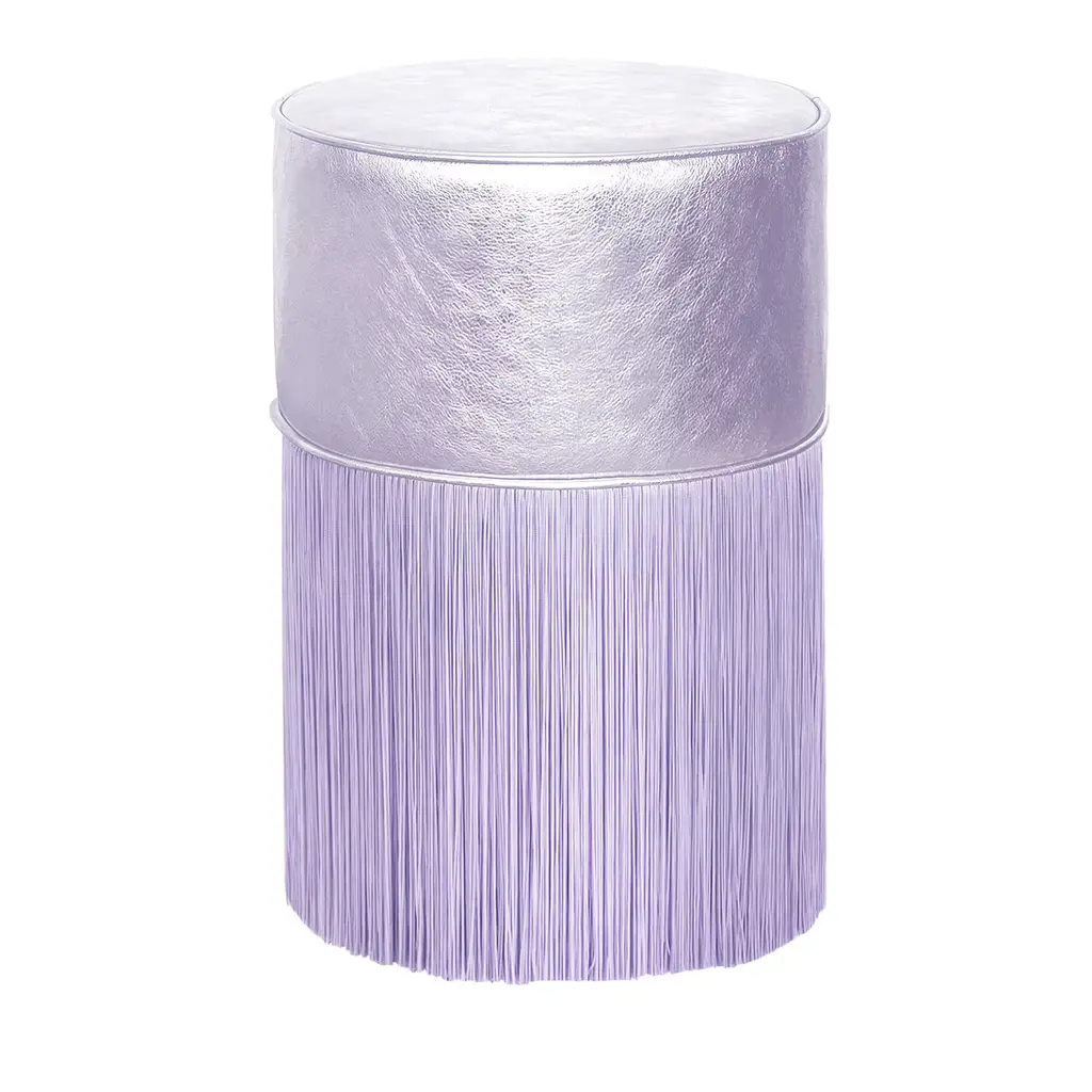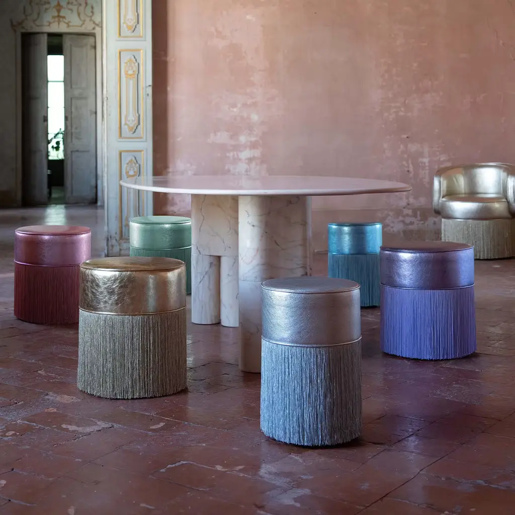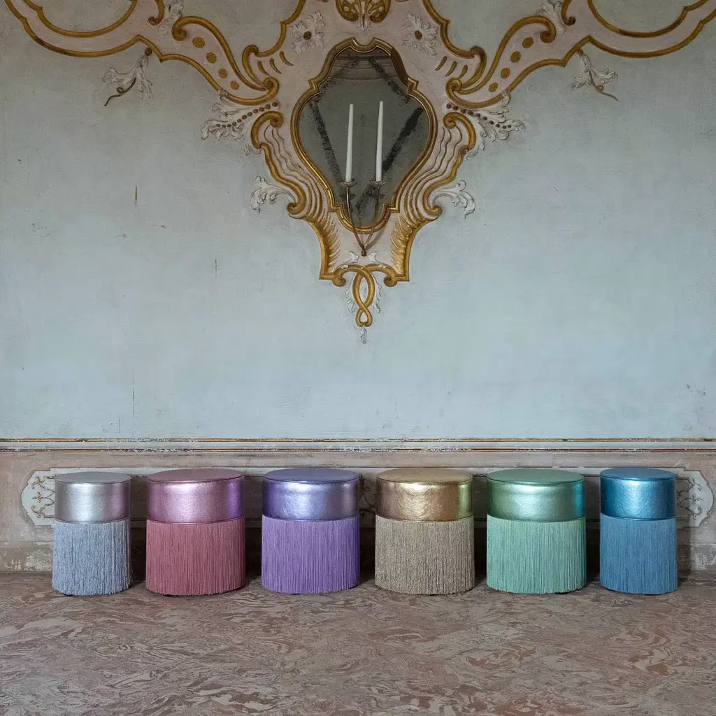 The Gleaming collection by Lorenza Bozzoli Couture shines in its own light and captures attention with its lustrous allure. The seatings of the signature fringed poufs have been enveloped into foil-finished leather glossy and radiant, carefully selected in different hues. The iconic fringes are proposed in silver. The Gleaming collection it’s a fusion of futuristic luxury and timeless design, creating a balance between classic elegance and avant-garde aesthetics. Each bespoke piece is stamped on the bottom of the pouf’s lining and personally signed, numbered, and dated by designer.