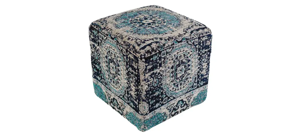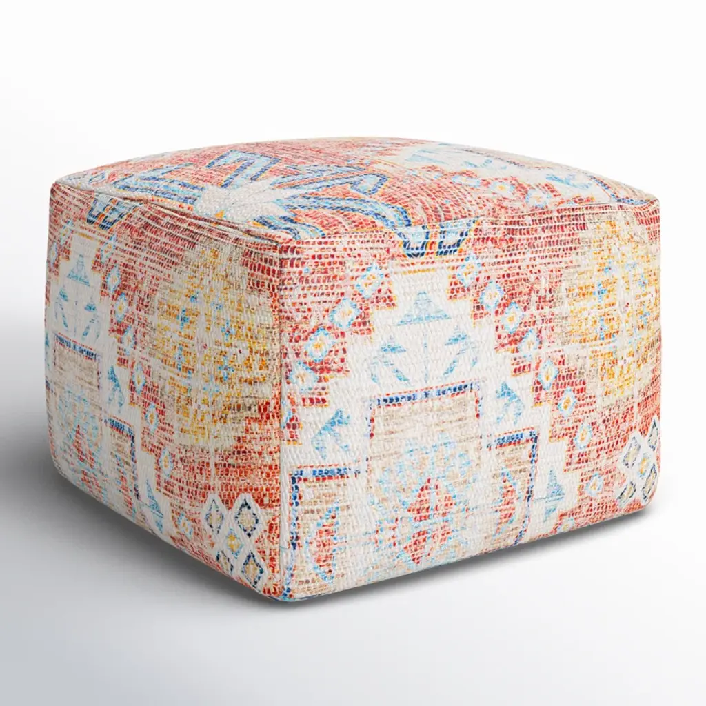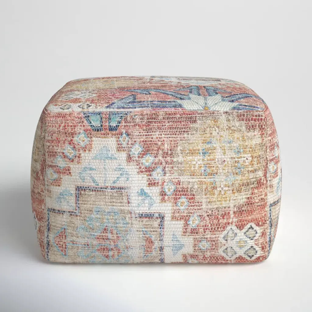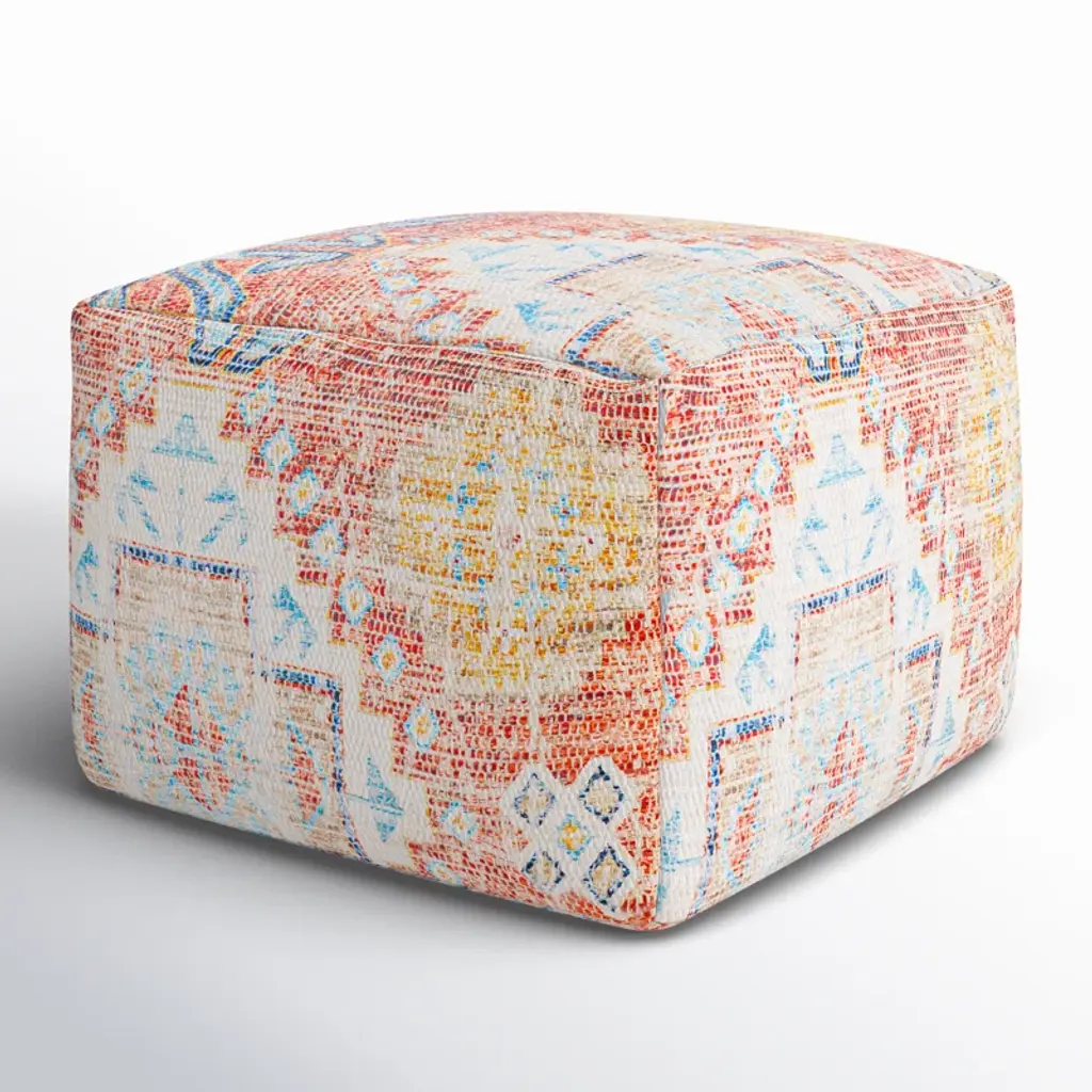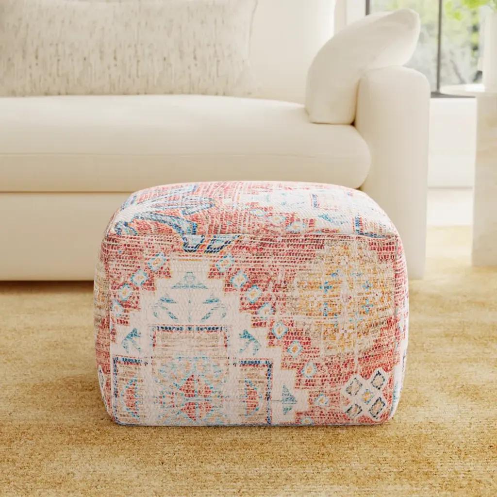 Drawing from globally-inspired designs, this pouf is the perfect way to add a touch of boho charm to your living room or bedroom. It's woven in India from a blend of polyester and cotton and features a multi-colored geometric pattern throughout its square body. Intentional distressing adds a timeworn touch for the look of a vintage-inspired piece without the wear and tear. Make it yours: Use it as a place to kick up your feet, a spare seat, or even as a stand-in for a coffee table in a small space.