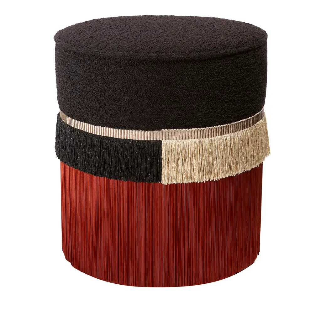 A gray pouf with geometrical shapes created with multiple layers of multicolor viscose fringes. They are of different lengths and stacked on top of each other creating an iconic pattern. The base of the pouf is in painted beech wood and the top cushion is padded with synthetic material and upholstered with gray velvet 100% trevira. Everything is entirely made in Italy. Each bespoke piece is stamped on the bottom of the pouf’s lining and personally signed, numbered, and dated by designer.