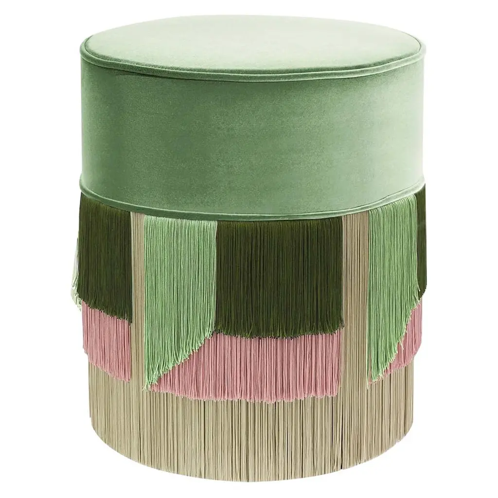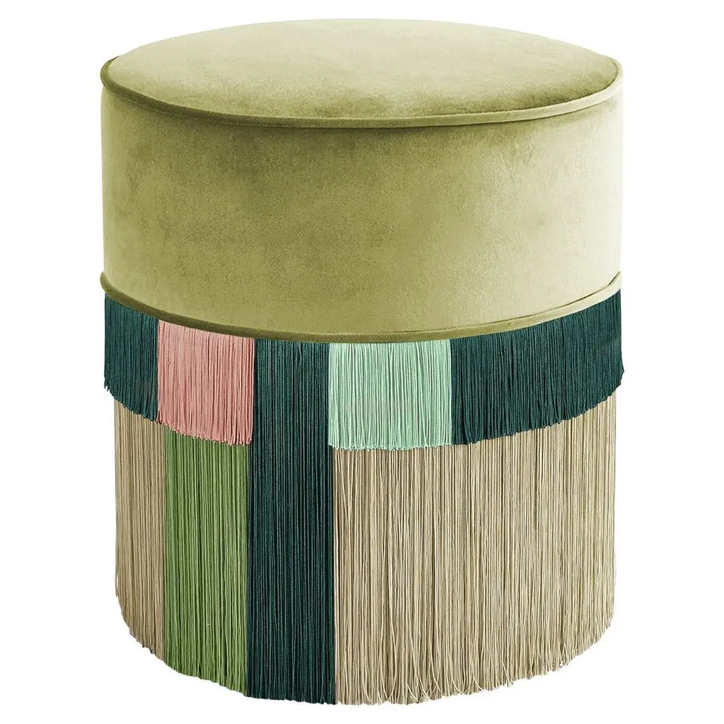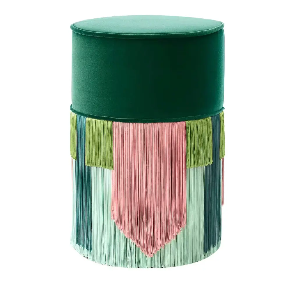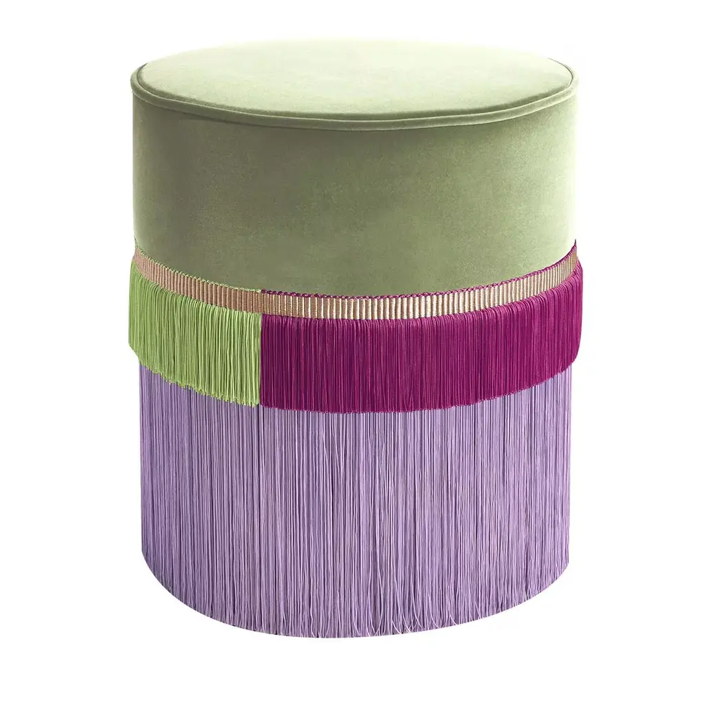 This unique pouf, green on top and mostly purple on the bottom, is a fantastic piece to give character and personality to any space. The top consists of a synthetic padding upholstered by prime green velvet while, the bottom, is a painted beech wood base covered by an array of multicolor viscose fringes. This product is entirely made in Italy.
