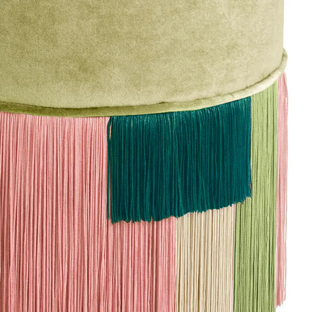 This is a cylindrical pouf that is unique thanks to the multiple layers of viscose fringes it has. They are in different colors and lengths and create a unique artistic and geometric motif. The base is in painted beech wood and the top is synthetically padded and upholstered with superior green velvet 100% trevira. This product is entirely made in Italy. Each bespoke piece is stamped on the bottom of the pouf’s lining and personally signed, numbered, and dated by designer.