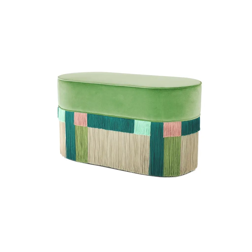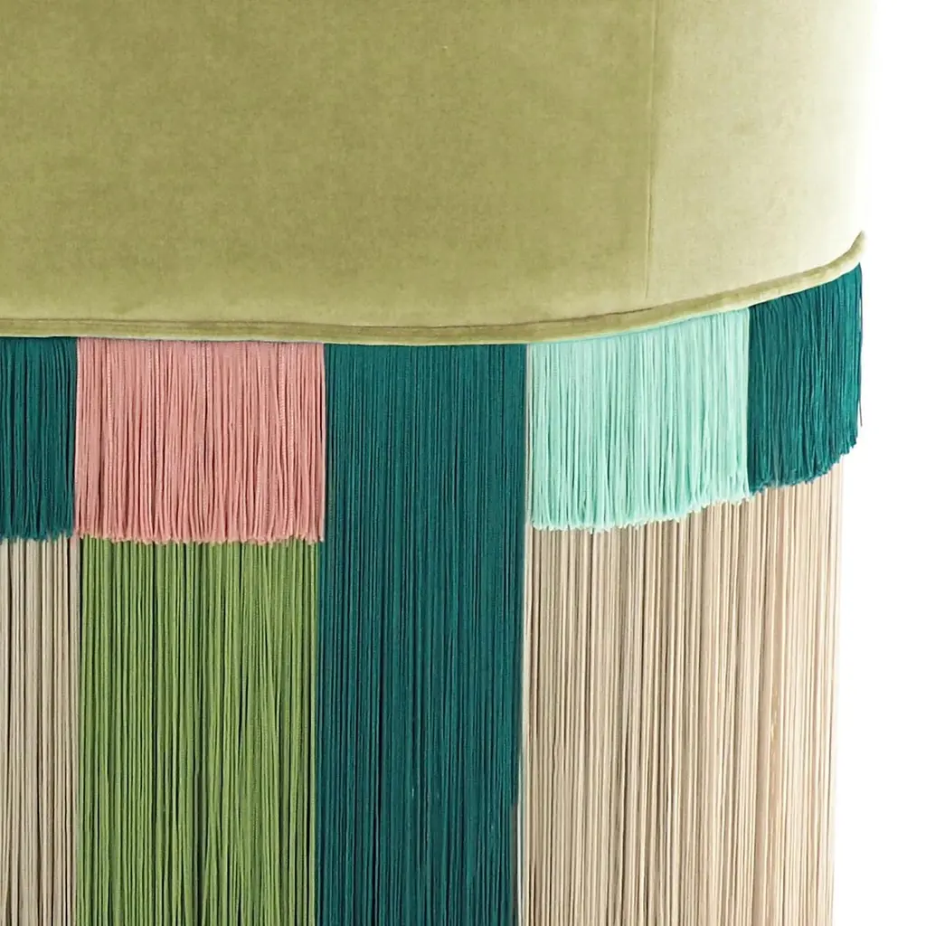 A large pouf with green velvet upholstering on top and a layer of multicolor viscose fringes attached to the painted beech wood base. They are the ones that give the name to this pouf because as shown in the image they create a unique geometrical and colorful motif. This item is entirely made in Italy.