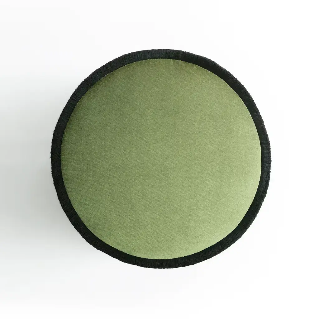 IL Pouf | Graphic is a collection with a minimal and graphic style, geometric and functional shape, made with top quality materials. The black fringes that outline the round perimeters underline the geometric and modern style, which can also be inserted into a classic living room. Cylindrical in shape and realized in a solid wood frame, upholstered with high-quality fabrics and impeccable soft fringes, IL Pouf is softly padded and raised on a satin brass-finished plinth.