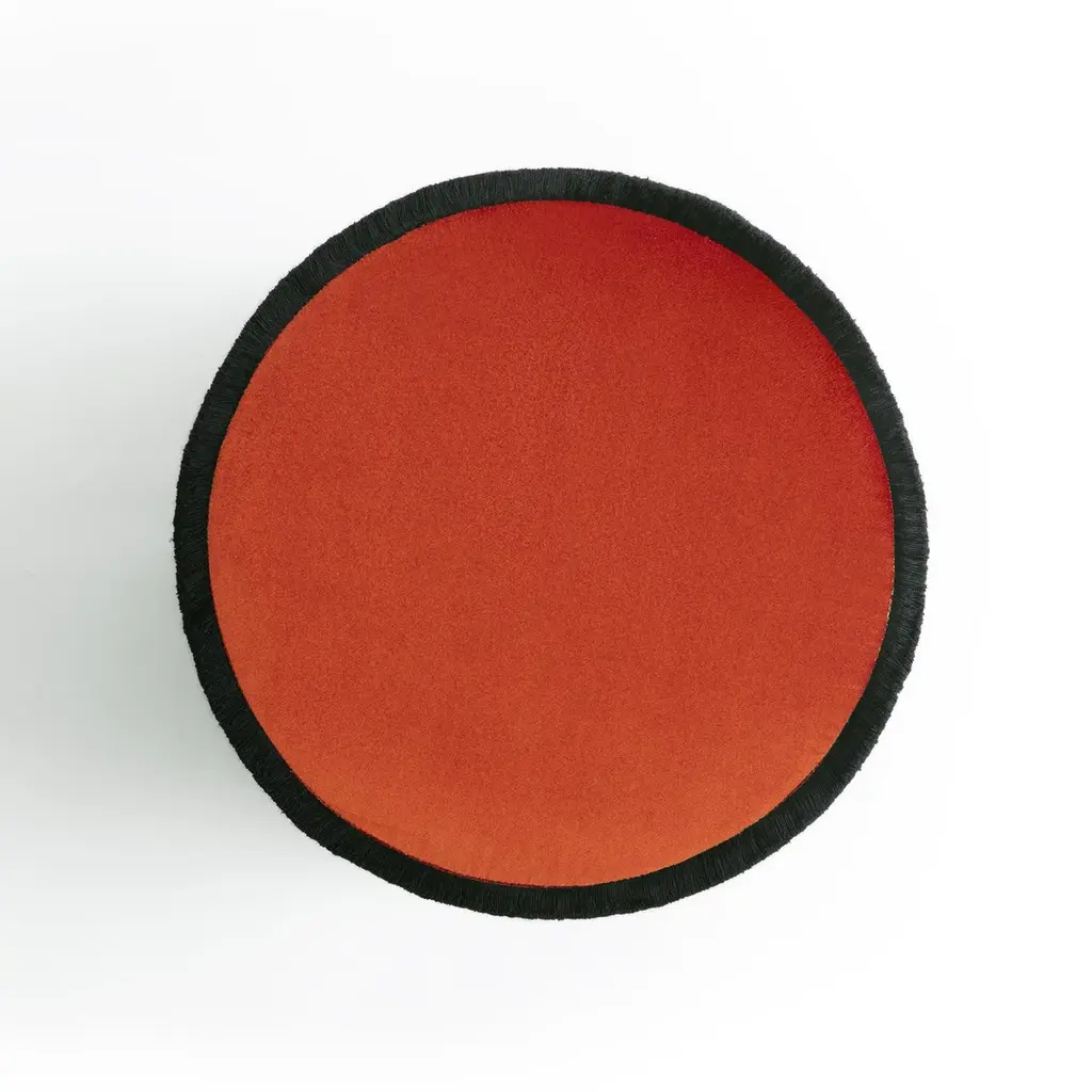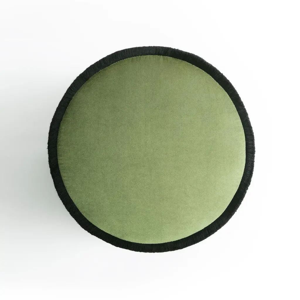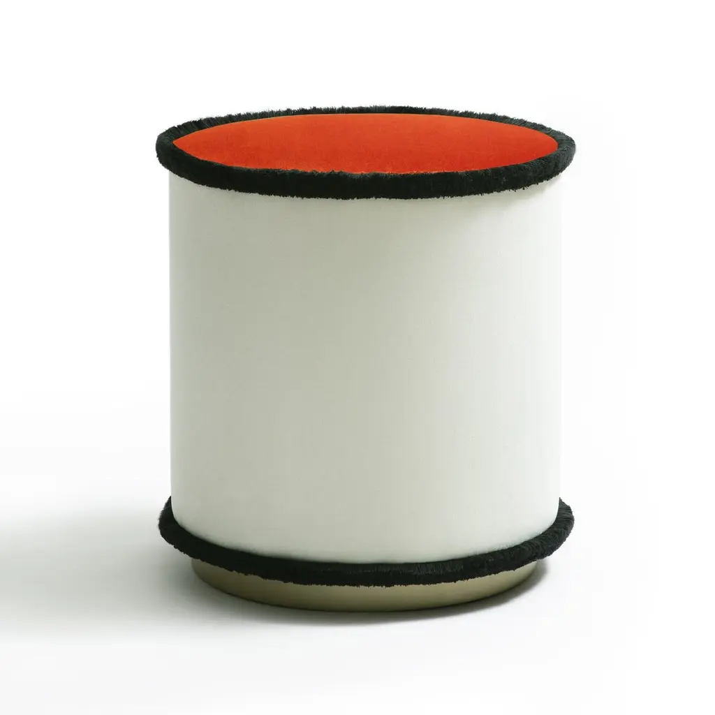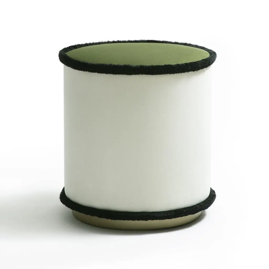 IL Pouf Graphic is the collection with a minimal and graphic style, geometric and functional shape, made with top quality materials. IL Pouf Graphic features three white velvet poufs with a hint of color on the seats in the brick, mustard and green lines. The black fringes that outline the round perimeters underline the geometric and modern style, which can also be inserted into a classic living room. This collection combines functionality and high aesthetic and qualitative value, where the classic style is revisited in a modern key. LO Decor IL Pouf is a splendid showcase of meticulous craftsmanship and innovative design. For the most demanding and sophisticated clients , this last outstanding LO Décor creation reflects the Italian refined design that combines functional products, high quality and design value. IL Pouf is the perfect synthesis of art and craftsmanship, where the skills of talented Italian artisans are employed to create poufs that enhance the value of impeccable details. The commitment to excellence involves and characterized LO Décor IL Pouf.Cylindrical in shape and realized in solid wood frame, LO Décor IL Pouf echoes the refined mood design of its designer Lorenza Briola, noted for her highly sophisticated aesthetic and meticulous production process. Upholstered with high quality fabrics and impeccable soft fringes that run around the perimeter of the seat and at the bottom, IL Pouf is softly padded and raised on a satin brass - finished plinth that coats the wooden base adding a precious, bright accent to the whole design. The iconic LO Décor fringes are proposed in different hues, underlining the fusion of geometric and timeless design, creating a balance between contemporary and classical aesthetics.Elegant and minimal, striking in its simplicity, this refined pouf is a perfect accent piece for any refined living.