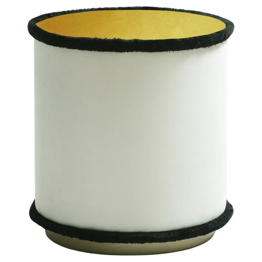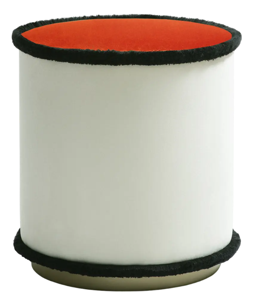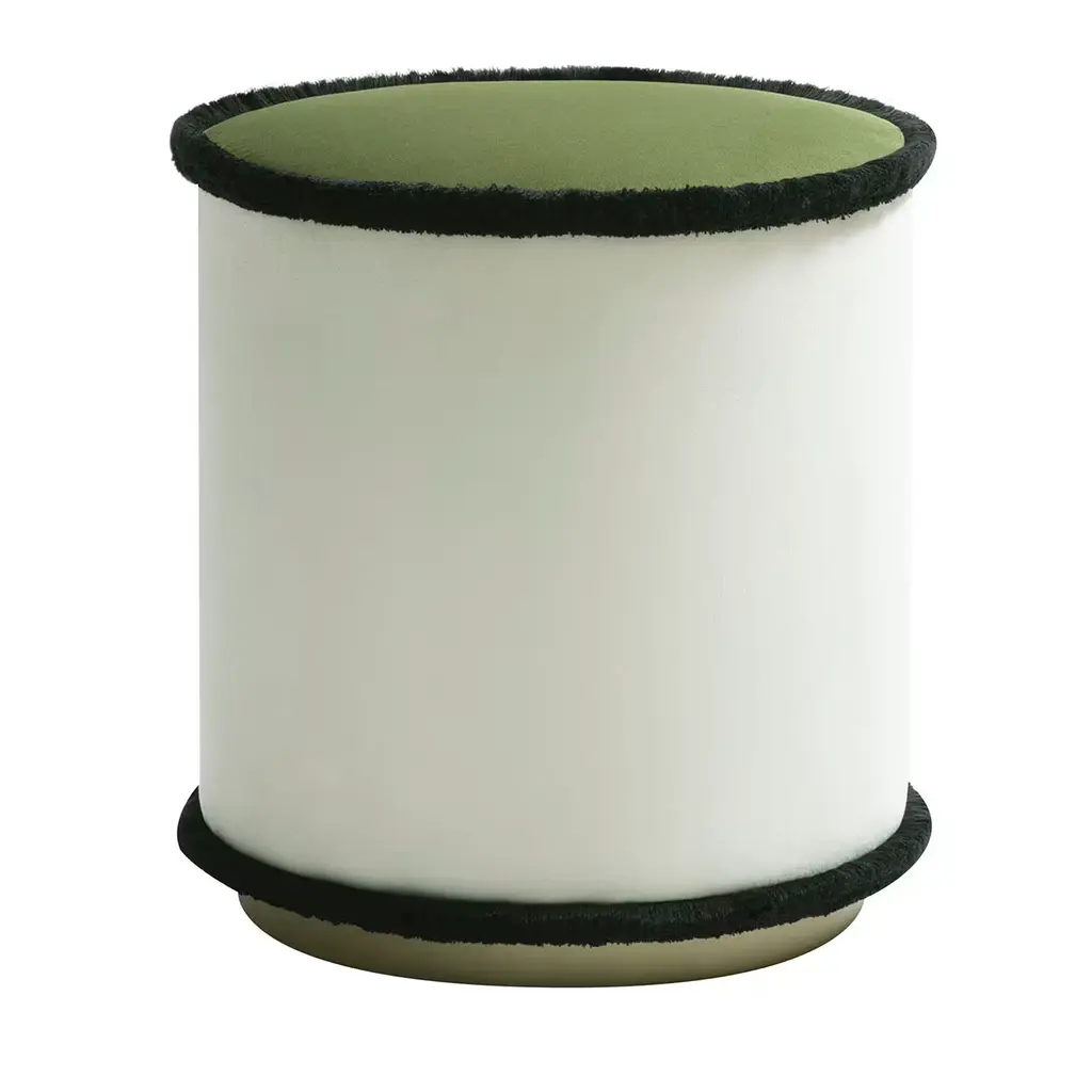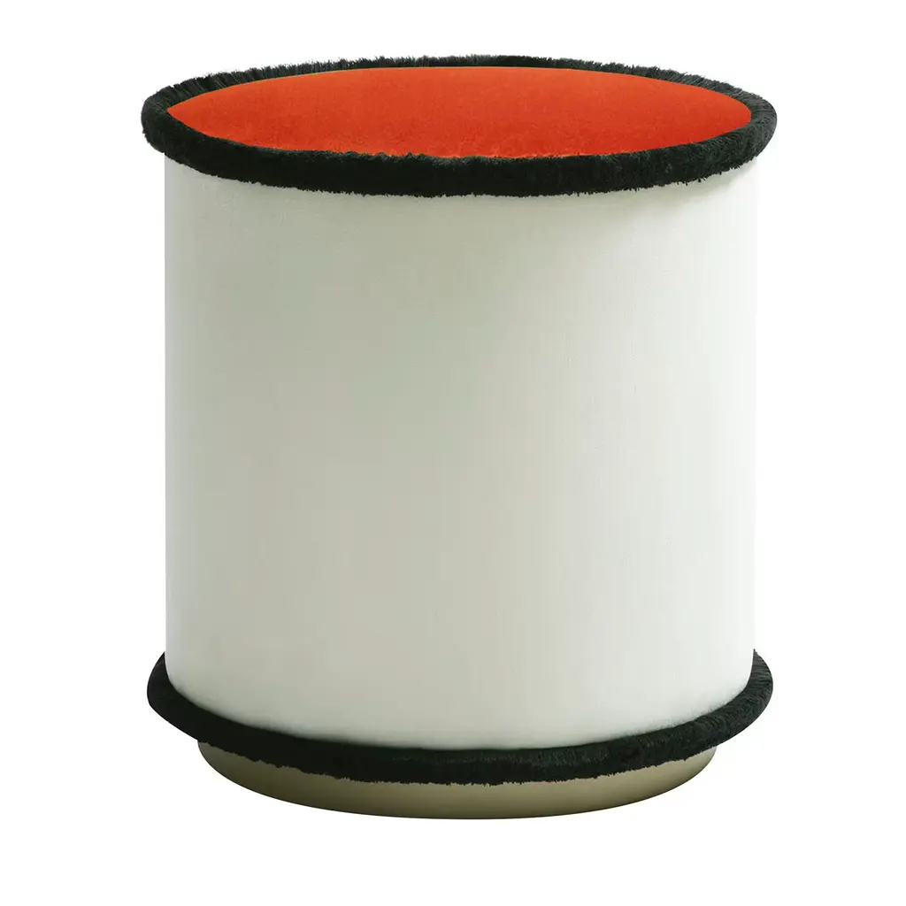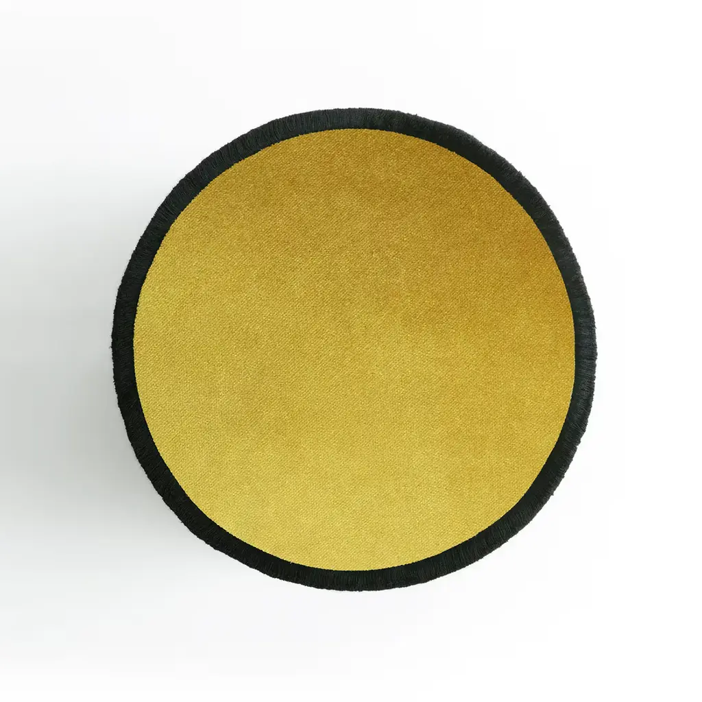 IL Pouf | Graphic is a collection with a minimal and graphic style, geometric and functional shape, made with top quality materials. The black fringes that outline the round perimeters underline the geometric and modern style, which can also be inserted into a classic living room. Cylindrical in shape and realized in a solid wood frame, upholstered with high-quality fabrics and impeccable soft fringes, IL Pouf is softly padded and raised on a satin brass-finished plinth.