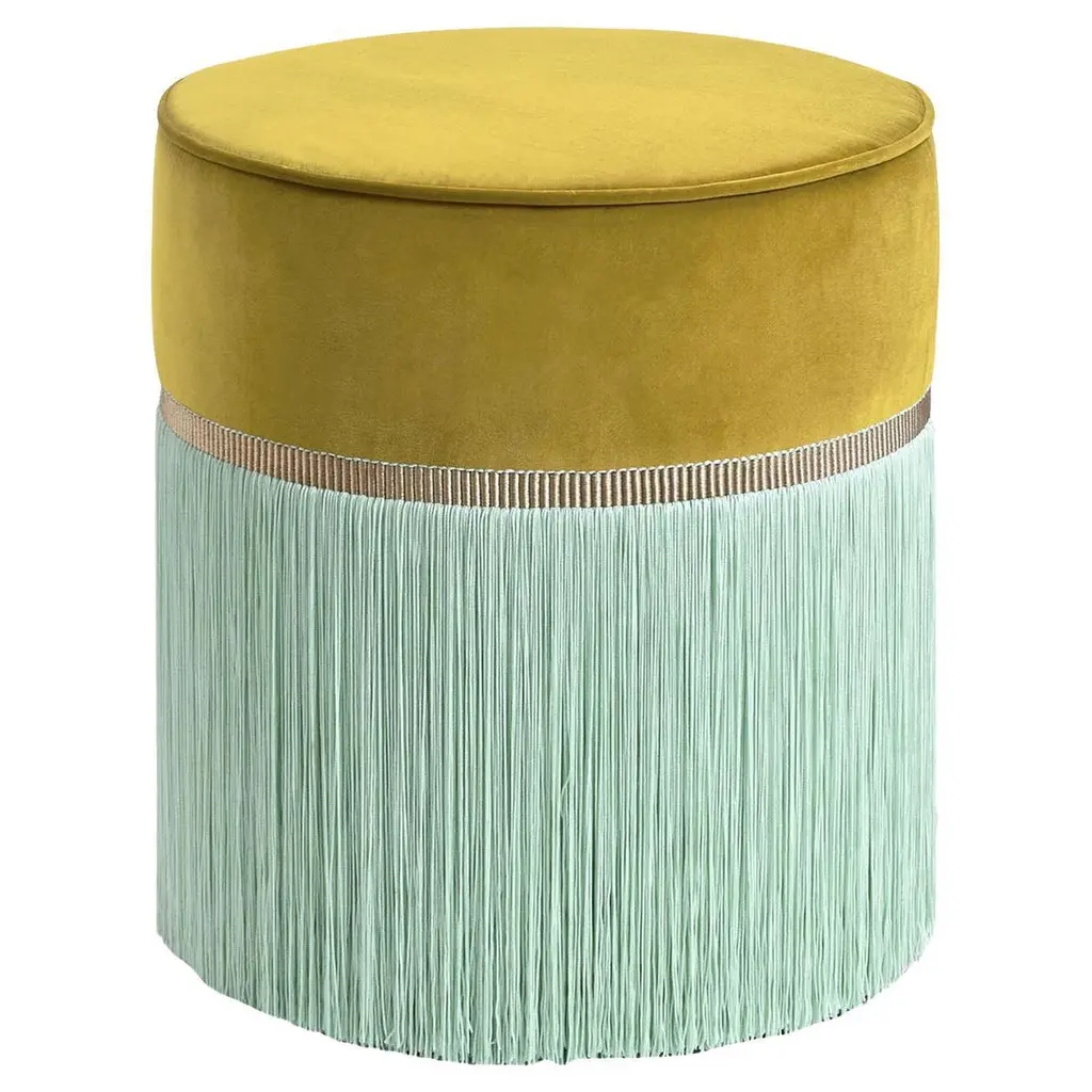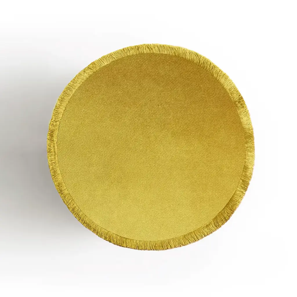 IL Pouf | Tone on Tone is the pouf collection presented in different hues, here in mustard. These refined poufs embellish any environment with their simple and compact design. Imbibing any space with a natural appeal, IL Pouf is upholstered in soft velvet wrapped in thick fringes to create a cozy look. Cylindrical in shape and realized in a solid wood frame, upholstered with high-quality fabrics and impeccable soft fringes, IL Pouf is softly padded and raised on a satin brass-finished plinth.