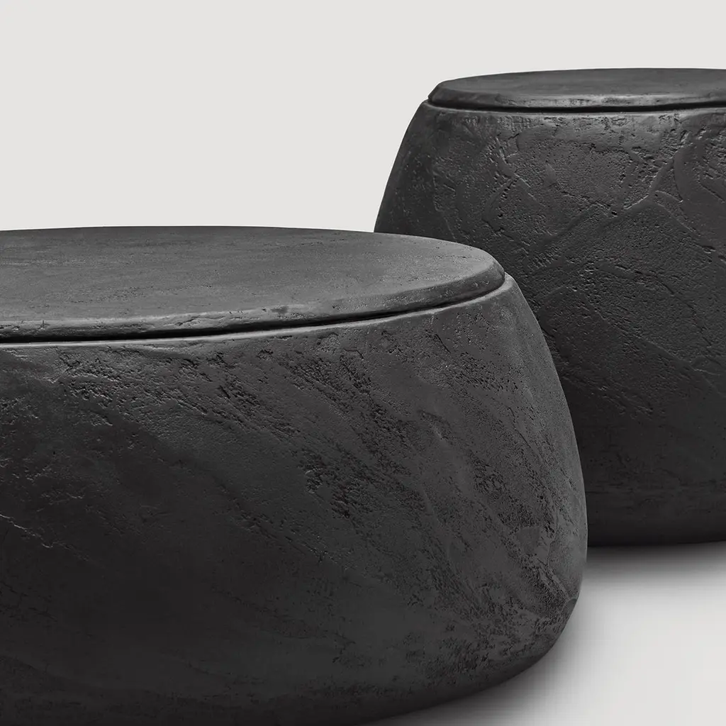 A singular piece of sculptural allure, this splendid pouf is the result of the harmonious combination between masterful craftsmanship and contemporary flair. Perfectly suitable for both indoor and outdoor decors, it comprises a solid structure made of rigid polyurethane covered by hand with a layer of black lava stone compound. This piece is also available in another size (80 x H 30 cm) as well as in gray lava stone, cement, or red cement exclusively upon request.