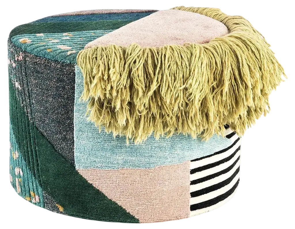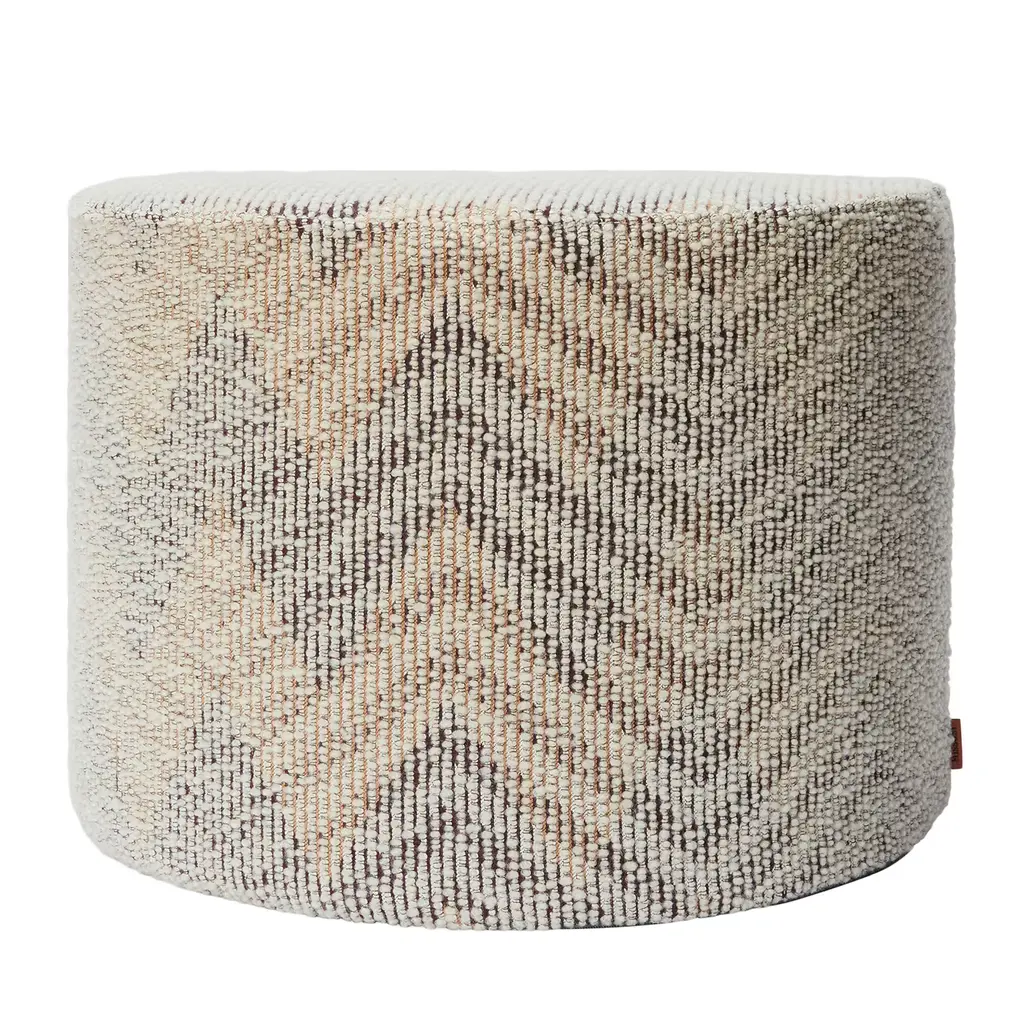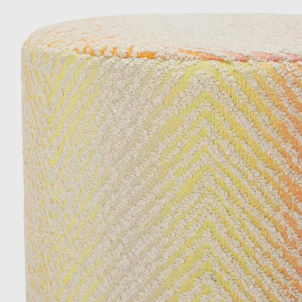 Sunny and refined in its clever interplay of vibrant details and clean profiles, this cylindrical acrylic pouf makes for a spot-on solution for adding a dash of liveliness to contemporary terraces or patios. Orange, pink, and yellow tones interact in a delicate shaded effect, creating a colorful backdrop for the extensive boucle chevron pattern to neatly emerge in its hypnotizing charm.