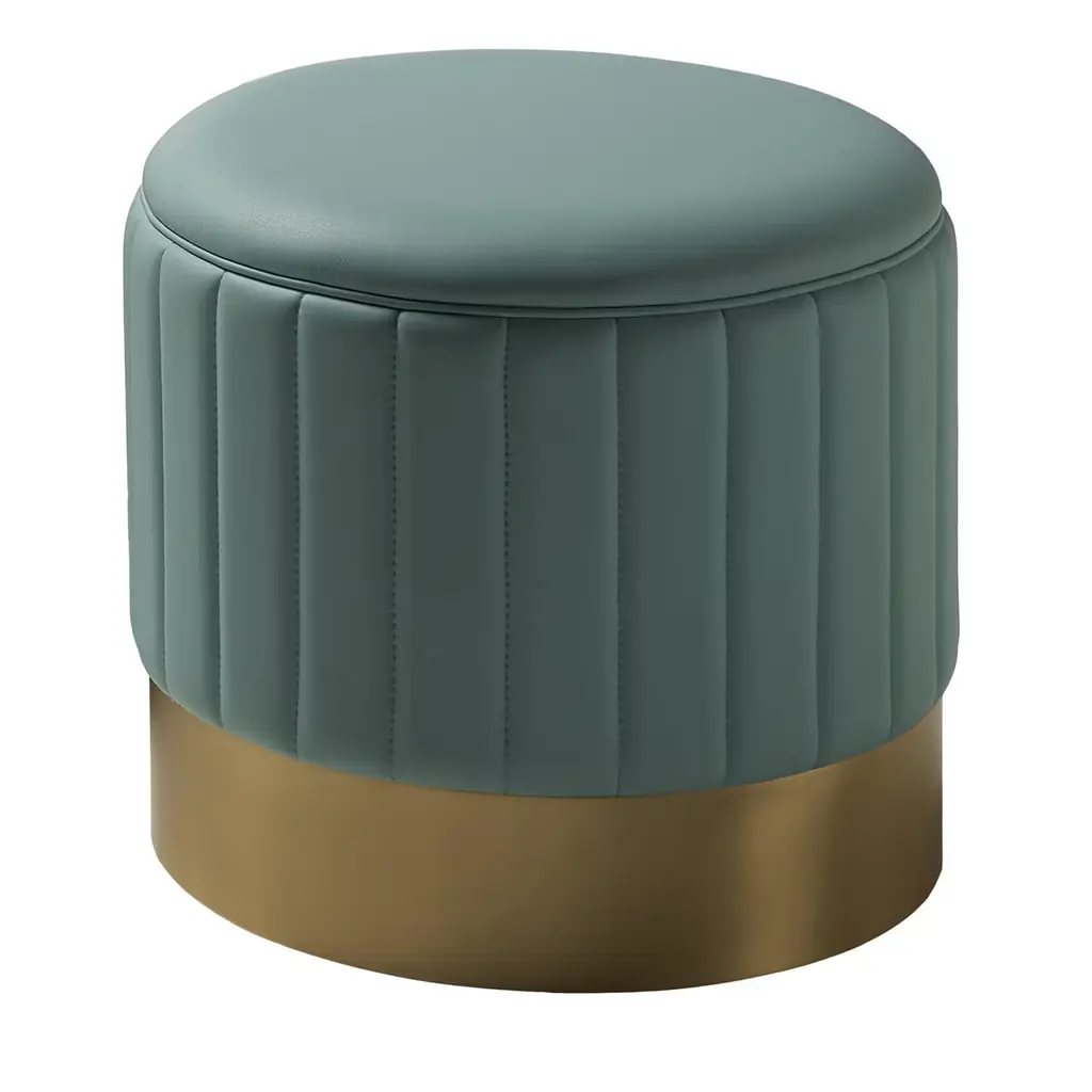This sophisticated, handcrafted pouf exemplifies modern taste for restrained elegance. A superb addition to both residential or commercial spaces, it features a solid wooden frame shaping its cylindrical body, which boasts a luminous base with a metallic finish and generous leather upholstery in light-brown dressing the upper section. The conflict between the smoothness of the seat and the channeled texture enlivening the sides creates a pleasant tactile feel.