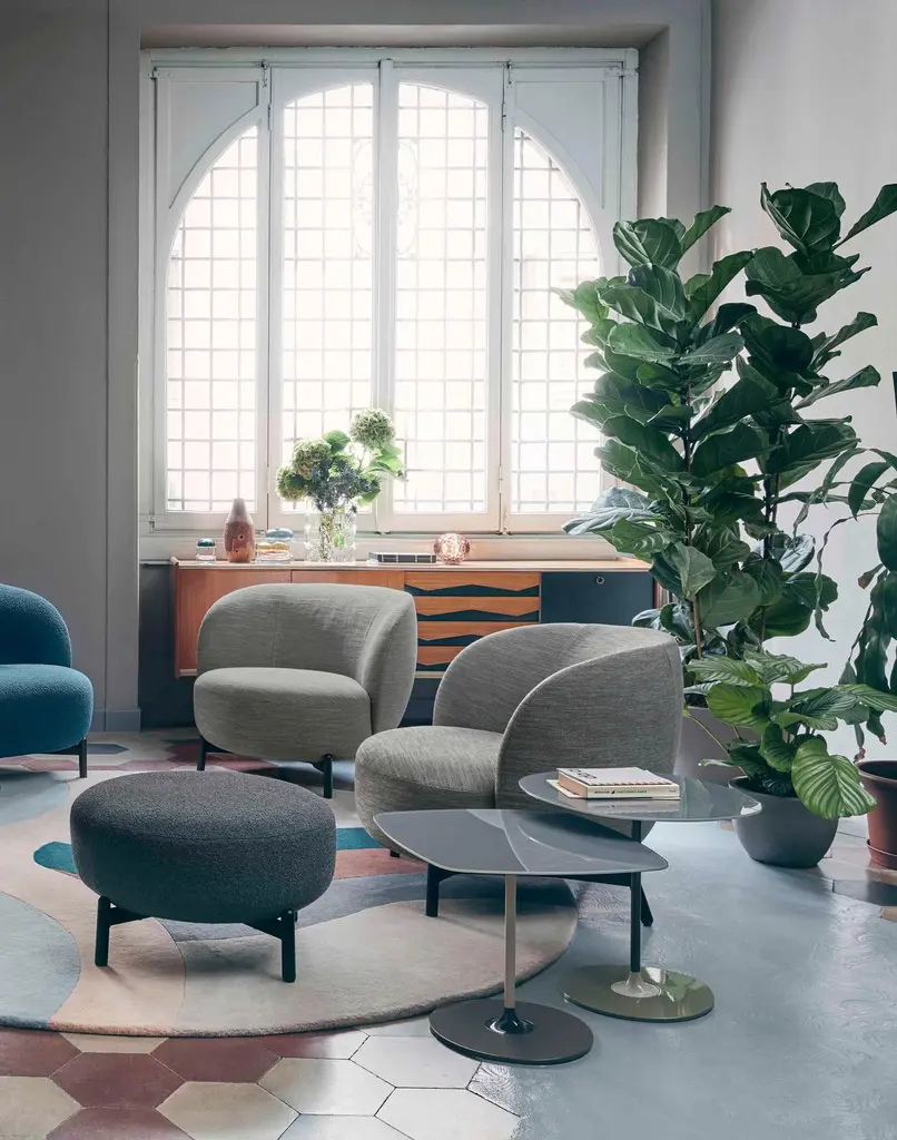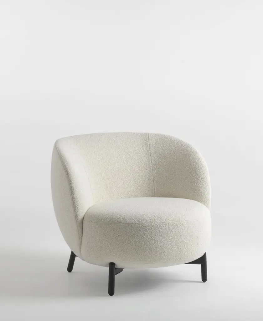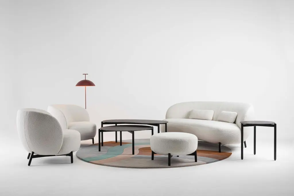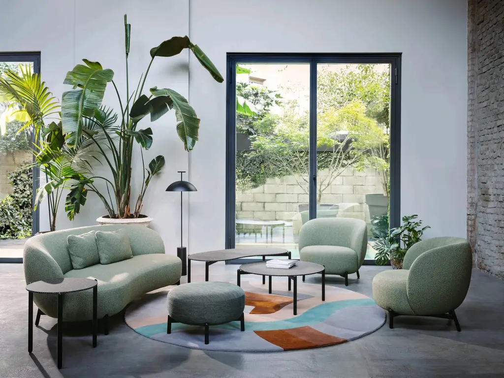 LUNAM is an enchanting living space furniture collection inspired by the dreamy atmosphere of a lunar landscape. An essential, painted metal structure supports generously dimensioned upholstered sections. Sofa, armchair and pouffe come in soft bouclé fabric or mélange (the contract option) in Olive Green, Petroleum, Siena Earth and a choice of greys.