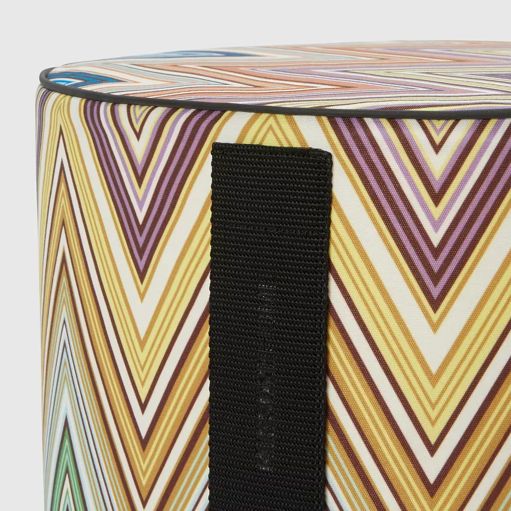 Eccentric and colorful, this cylindrical pouf made from polyester is the perfect solution for accenting outdoor spaces with a dash of liveliness. The extensive zig-zagged pattern - a signature trait of Missoni's collections - is here offered in a chromatic palette where yellow and green tones prevail. Contrasting piping and branded handle complete this glamorous piece.