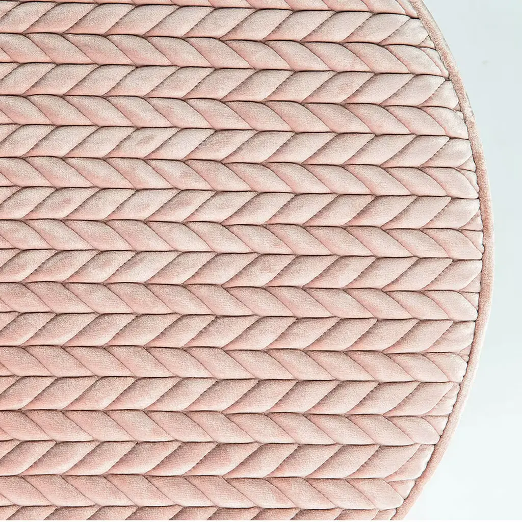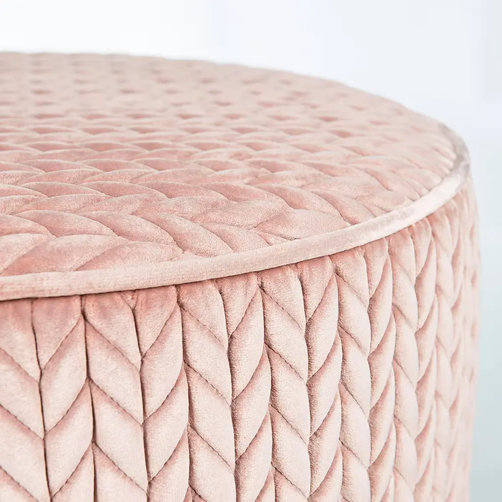This sophisticated round pouf will stand out in any decor adding a glamorous flair. Inspired by the Belle Époque spirit of the nineteenth century, this piece of functional decor captures its unique elegance and romantic style. Supported by a plinth base with an antiqued golden finish that complements the velvet soft pink fabric, the intricate and graphic herringbone motif delivers a sense of luxury. Used as seat or table with a tray on top, this pouf will accent any living room or bedroom. Upholstery and dimensions customizable upon request. Contract and commercial certifications available upon request.