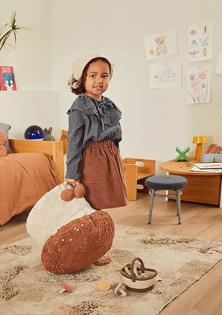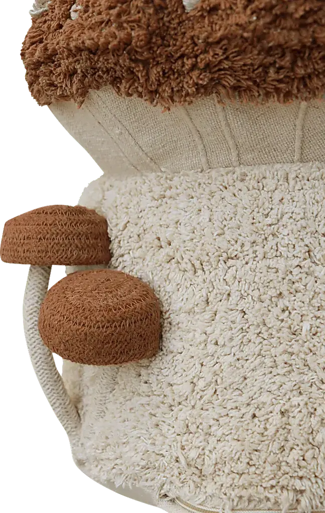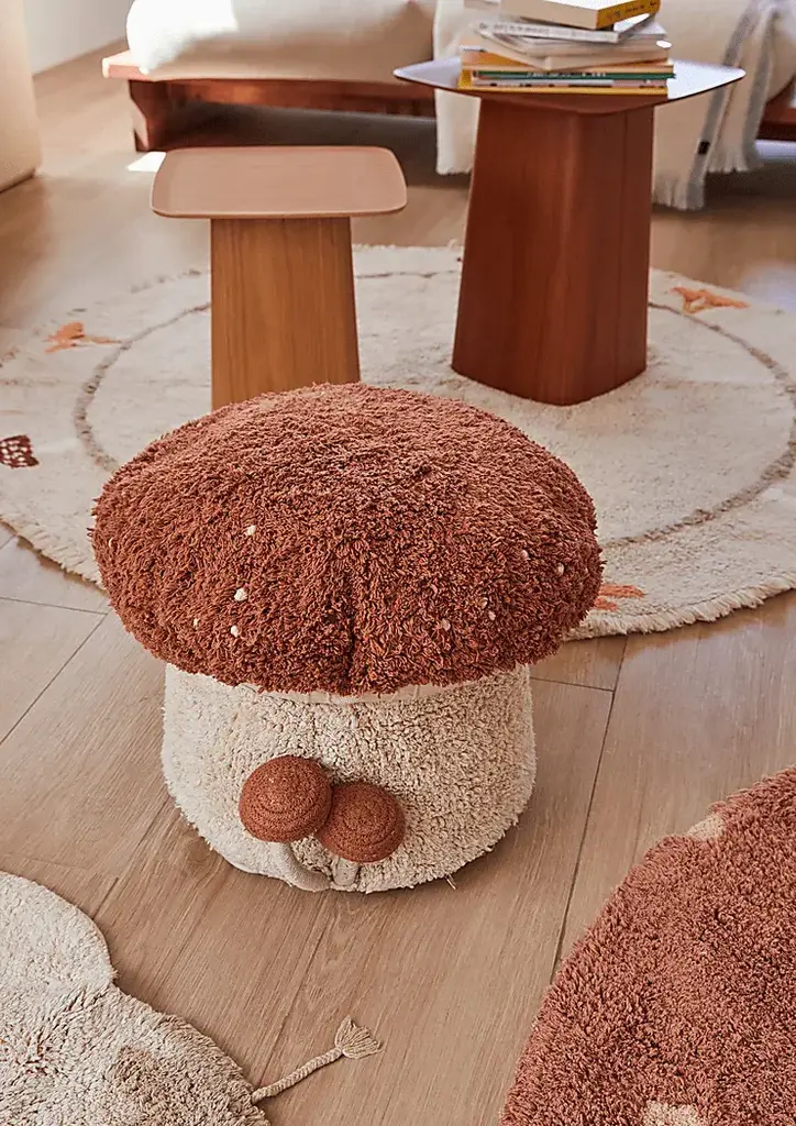 Meet the Boletus Pouf. It is a cozy mushroom-shaped seat that's as fun as it is functional. Designed by Lorena Canals, the soft, tufted bottom comes in a natural shade, while the toffee-colored top is sprinkled with cute, knotted dots. Two little braided mushrooms grow from the side, adding a magical woodland touch. The cover zips off easily for washing, and it's filled with lightweight polystyrene pearls for comfy, squishy seating. Customer assembly is required.