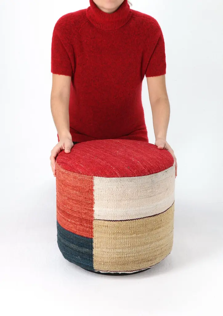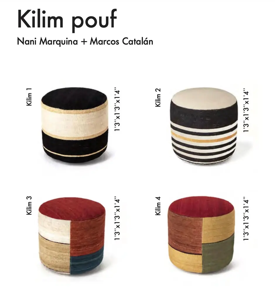 'Kilim 1' Pouf by Nani Marquina and Marcos Catalán for Nanimarquina.Executed in 100% hand-spun Afghan wool with a birch base and flame-retardant filling, this decorative accessory is the perfect way to add a touch of color to any room in the home. Choose between the two neutral models or, on the contrary, two colourful models to find the ideal chromatic balance at all times.This collaboration between Marcos Catalán and Nani Marquina expertly brings the textile world to a three-dimensional element. The warm geometric patterns on the poufs combine seamlessly to compliment any setting.Price is per item. Available in unlimited quantities. Choice of four different color palettes; this listing is for the 'Kilim 1' color combination.In-stock lead time 2-3 weeks. Out of stock can add additional 11 weeks or more. Stock availability is subject to change at any time. For time-sensitive orders, kindly inquire prior to purchasing.Made to order. All sales are final.Please note that due to the organic and handmade nature of this fiber some variation in color may occur from piece to piece, which may become further pronounced with prolonged exposure to sunlight.Also note this item must ship directly from Nanimarquina’s fulfillment center, so 1st Dibs arranged shipping and local pick-up are not an option. Shipping cost quoted is per item and cannot be combined.