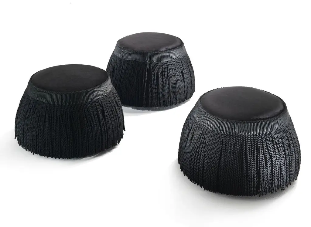 Elevate your space with the Kir Royal Footstool, a delightful creation by designer Christophe de la Fontaine. This footstool showcases an intriguing blend of irony and opulence, characterized by its lavish trimming and fringe. With a wooden structure, plush padding, and luxurious black velvet upholstery, it embodies a fusion of contemporary style, reminiscent of elegant curtain tassels