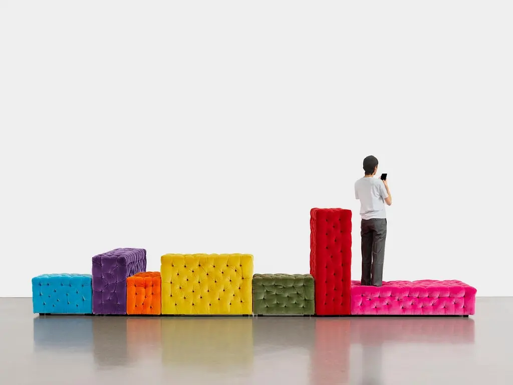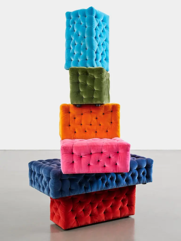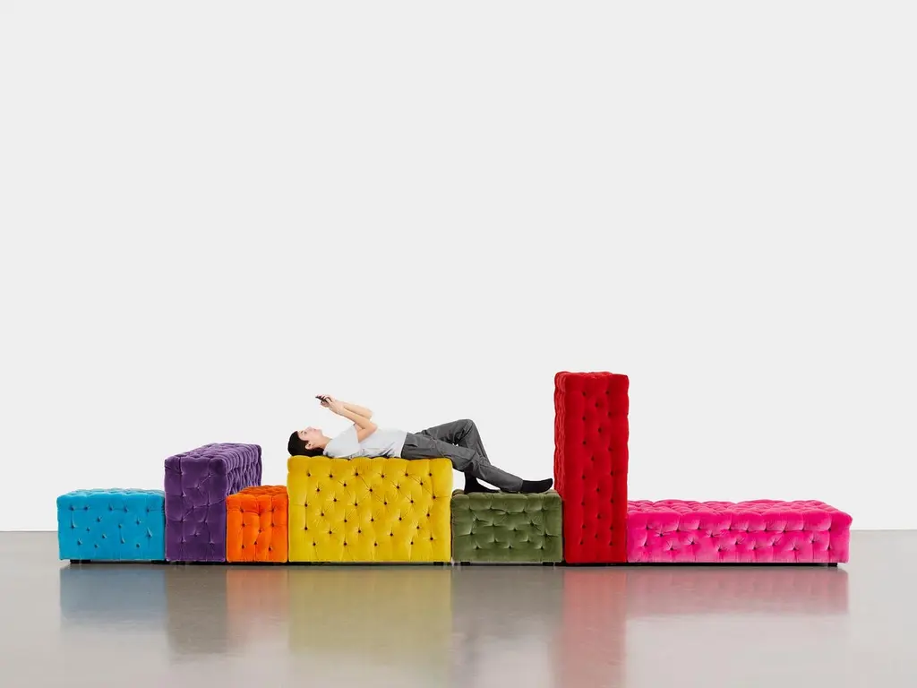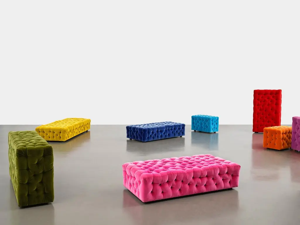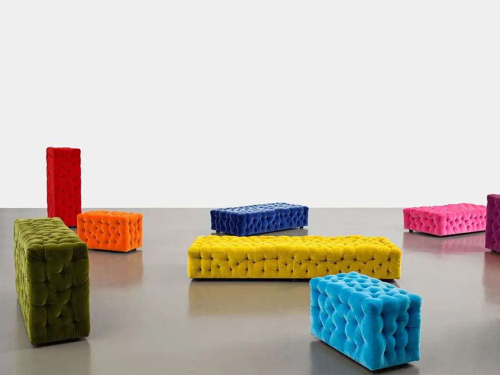 Modular sofa, made of eclectic modules, available in different sizes and colours, which can be continuously rearranged according to taste and needs.La Michetta by Gaetano Pesce for Meritalia is a sofa that does not conform to a predetermined style: it is an object made up of many objects, eclectic modules to be continuously played with and reorganized. The capitonné rises randomly, at times plunging and at times levitating, in contrast with the regularity of each rectangular or cubic module with wooden structure. The buttons mark the hollows of the surface and punctuate it, outlining a three-dimensional and irregular pattern that invites to explore the comfort of the seat.Limitless, even in its uses. The Michetta is for sitting down, for relaxing. Indeed, the very meaning of sitting down and relaxing is reconsidered, depending on whether the module is horizontal or vertical, if used as seat or backrest or armrest, single or multiple.Composition: 100% CottonPerformance: Durability/Fire test 70.000 Martindale (EN ISO 12947-2) BS 5852-cigaretteCare & Maintenance: Upholstery not removableWarning: Please be aware that the colour shades shown can appear different from the real fabric colours. It is advised torequest actual fabric samples before ordering.Care & MaintenanceTo preserve the appearance and colour of the fabric, it is recommended to use the vacuum cleaner with the appropriate accessory weekly. The dust left on the seats settles in the coating leaving marks.It is advisable to act on the stain as soon as possible. Most stains can be removed with a clean, humidified, wellwrung white cloth.Before proceeding with the cleaning, remove any excess liquid with a napkin or an absorbent cloth or any residues solidified with the vacuum cleaner avoiding pressing by penetrating the dirt into the fabric.If the stain persists, add only a small amount of neutral detergent, not directly on the lining, but on the damp cloth and gently rub. Try the operation first on an invisible part of the seat.Use pure soap-free water for the last wash. Do not soak the product.If the stain dates back a long time, it is advisable to turn to a professional.PaddingThe elements are padded in polyurethane and fiberfill.PackagingPackaging in cardboard box included.Packaging in cage to quote by volume.Packaging in wooden crate to quote by volumeAdditional information:Material: VelvetColor: Hazelnut V03Dimensions 115 x 115 x 38 cmWeight: 32 kgCode: MIPOUFF115Available in other color options: Wine V2007, Forest V1402, Cyan V32, Blush V17, Ochre V13, Lime V40, Cream V01, Night V54, Musk V1401, Cobalt V21, Pink V31, Orange V33, Navy V58, Steel V1406, Purple V19, Red V2008, Yellow V34, Grey V29, Sage V09, Sand V62, Brown V07