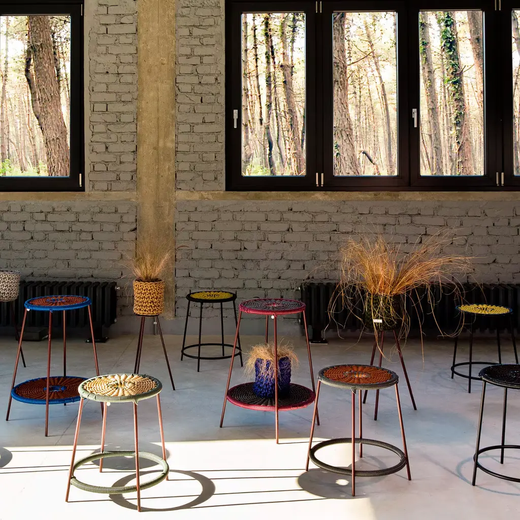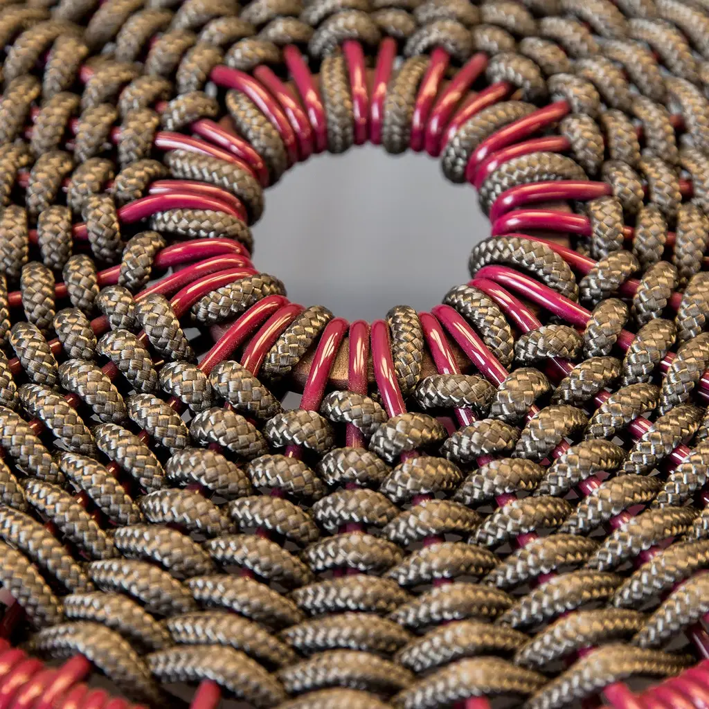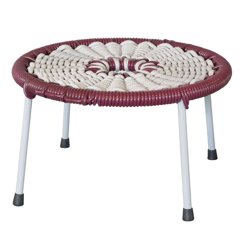 This pouf from the Le Rossette Collection will add unassuming refinement to any indoor or outdoor area, whether used as a seat or occasional table. Crafted of a slender cylindrical iron frame finished with burgundy powder-coating, the seat is woven directly onto the frame using a combination of glossy burgundy PVC (warp) and an anthracite-gray, water-resistant polypropylene technical rope (weft). Available in various colors and metal finishes, as well as sizes and heights, this pouf is a must-have, versatile piece of decor that will stand the test of time.