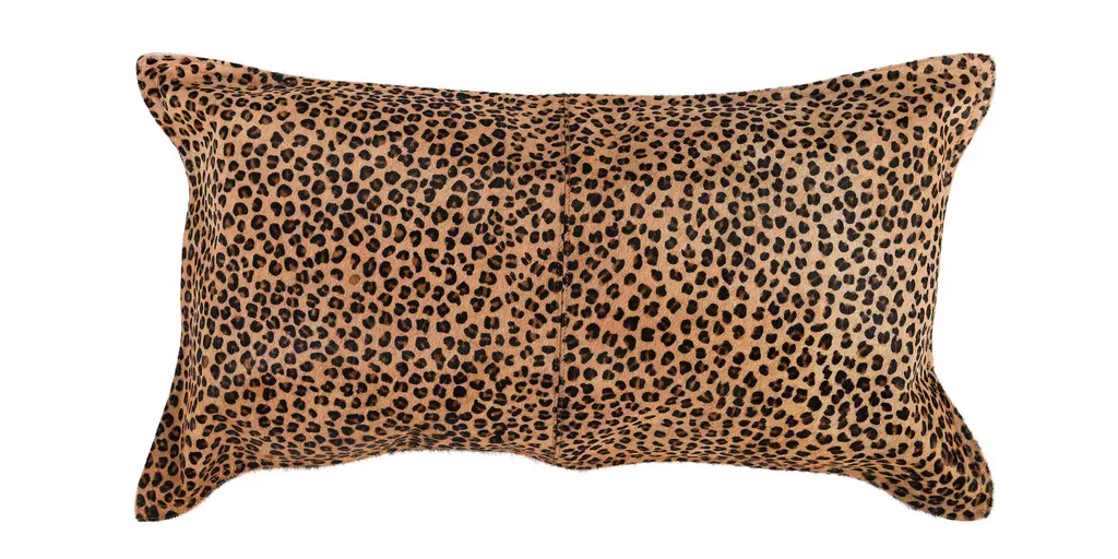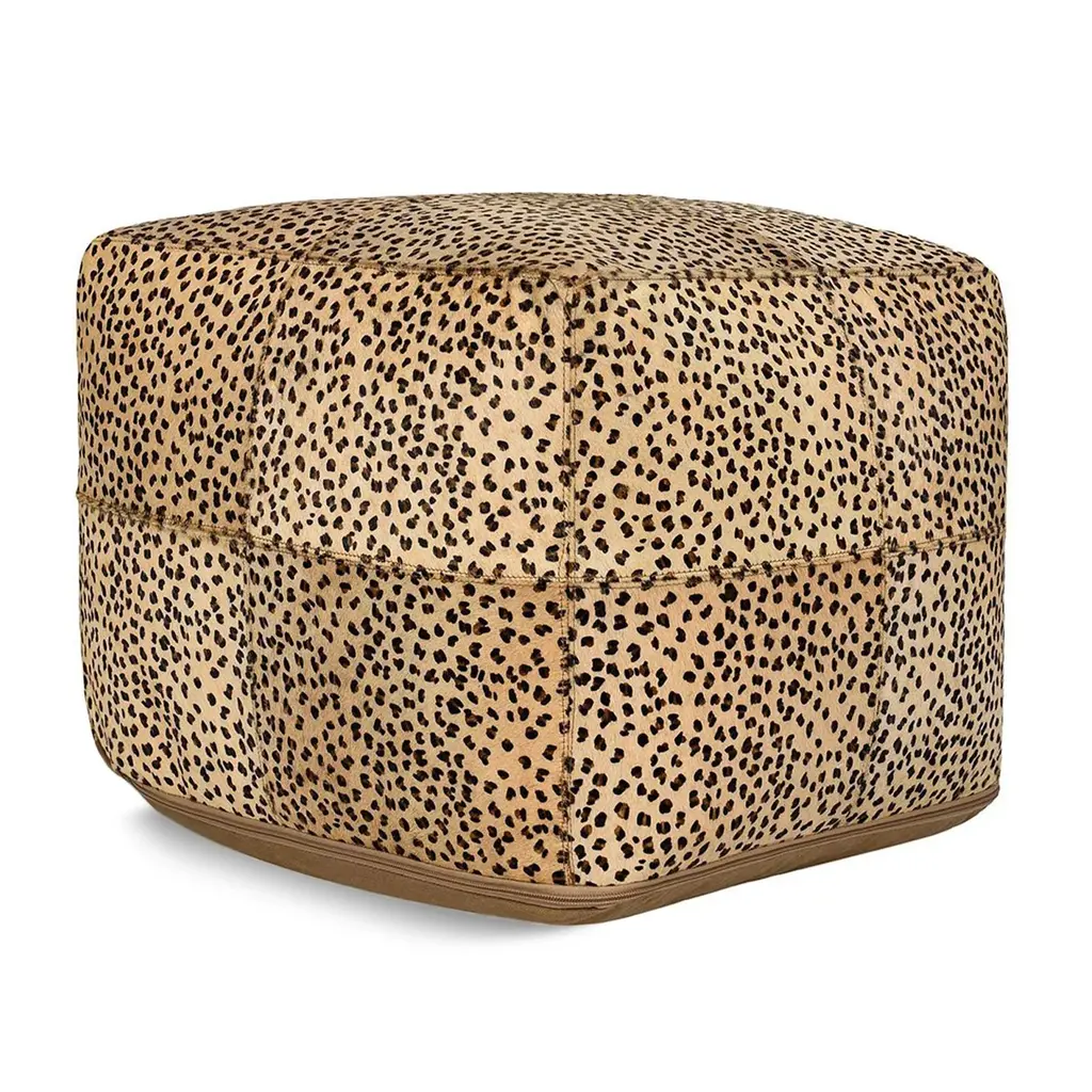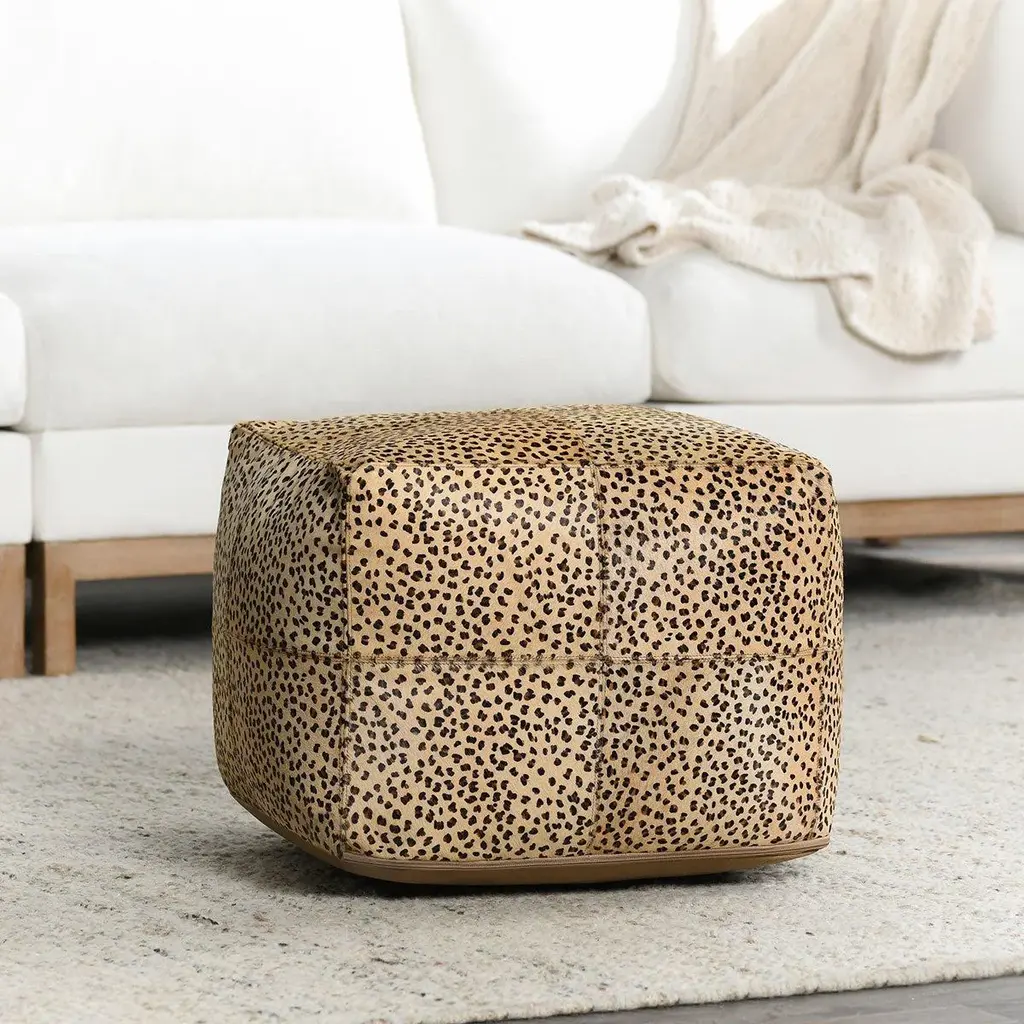 Hand dyed and painted leopard pattern 100% hide upholstered cube pouf ottoman. Stitched in square patchwork design. Each will vary slightly in exact coloring and handmade qualities. Lightweight polystyrene insert. Weighs approx. 4 lbs.