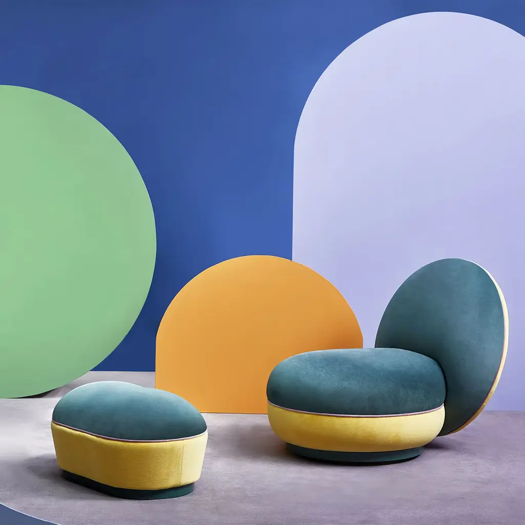 Exuding a lively pop personality, this artisan pouf is a striking synthesis of comfort and playfulness. Its enveloping curves outline an extremely plump silhouette, and the generous sustainable foam rubber padding is obtained from high-quality bio-based polyols processed from vegetable-origin oils and activators. Soft petrol-green and yellow fabrics eleven its design, the seat is accented with perimetral pink-toned piping. Additional fabrics and finishes are available upon request. Contact the concierge for more details.