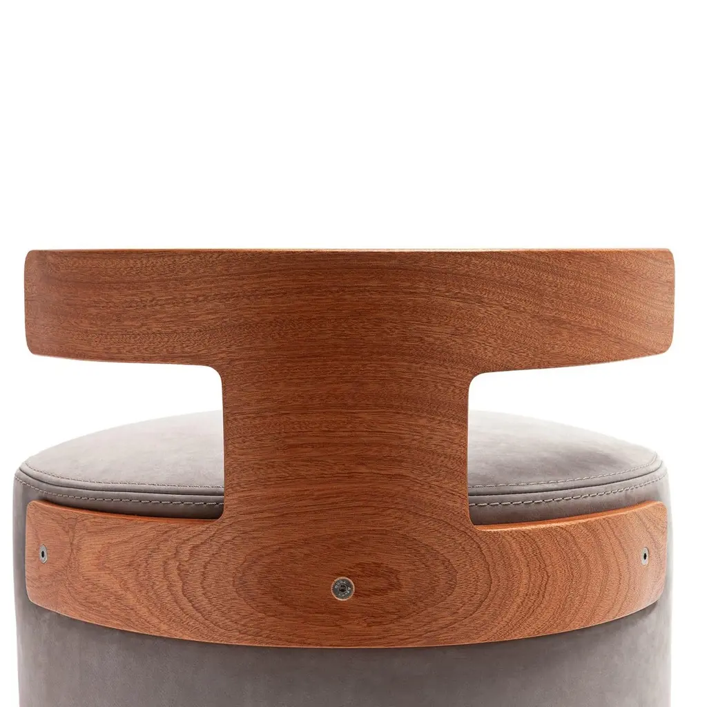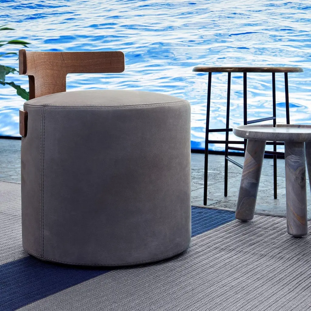 A customizable design of singular character, this pouf is a refined and ergonomic design by Massimo Castagna. Softly padded, the cylindrical seat is upholstered with beige Nabuk leather and is supported with a T-shaped backrest in mahogany. Recommended to cover with a protective upholstery if left outside, please ask the Concierge for details.