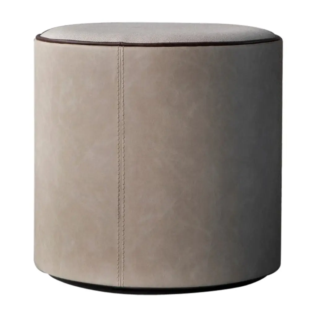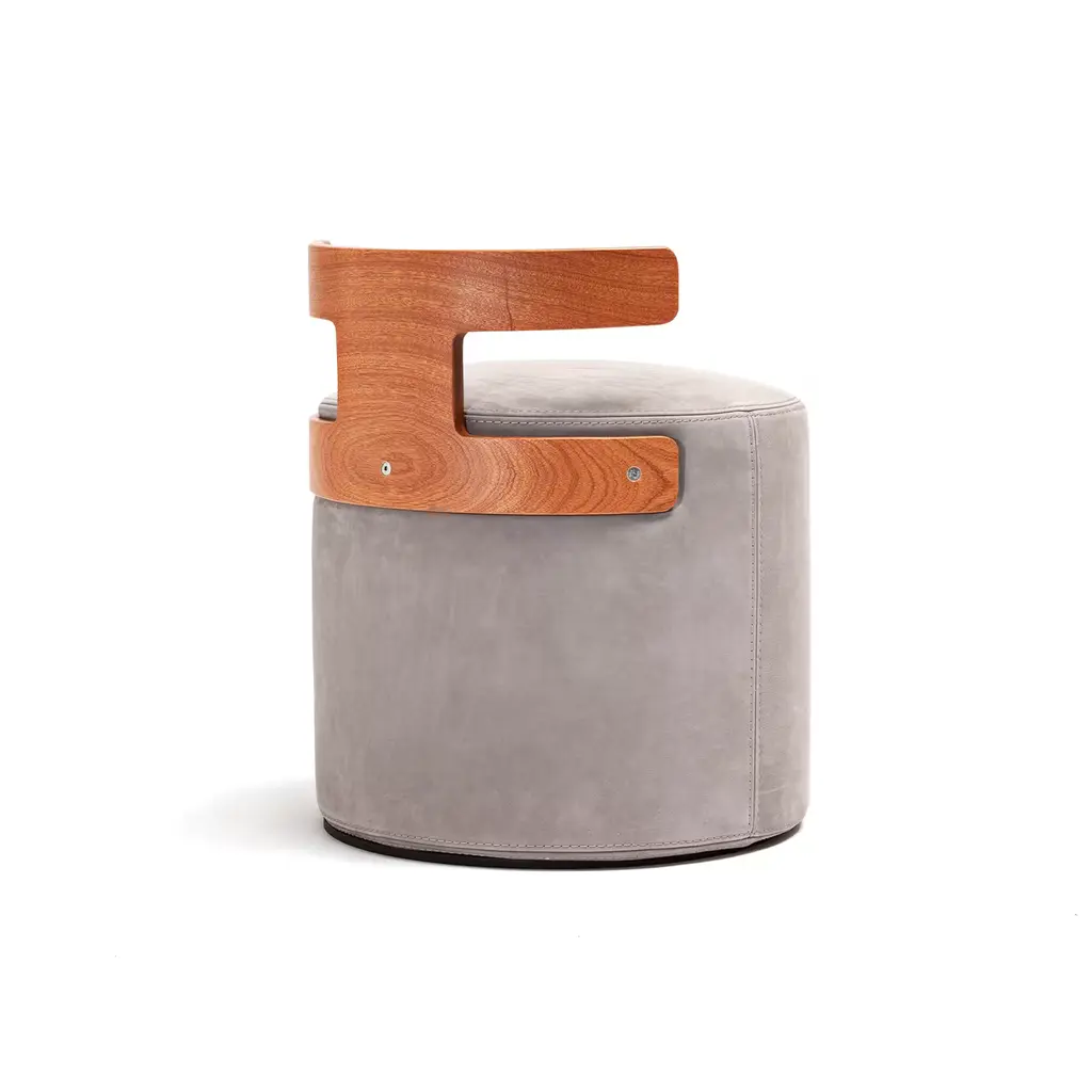 A customizable design of singular character, this pouf is a refined and ergonomic design by Massimo Castagna. Softly padded, the cylindrical seat is upholstered with beige Nabuk leather and is supported with a T-shaped backrest in mahogany. Recommended to cover with protective upholstery if left outside, please ask the Concierge for details. If the products are placed completely outside, nightcovers that can be purchased at an extra price are recommended. Please contact the Concierge for further information and options.