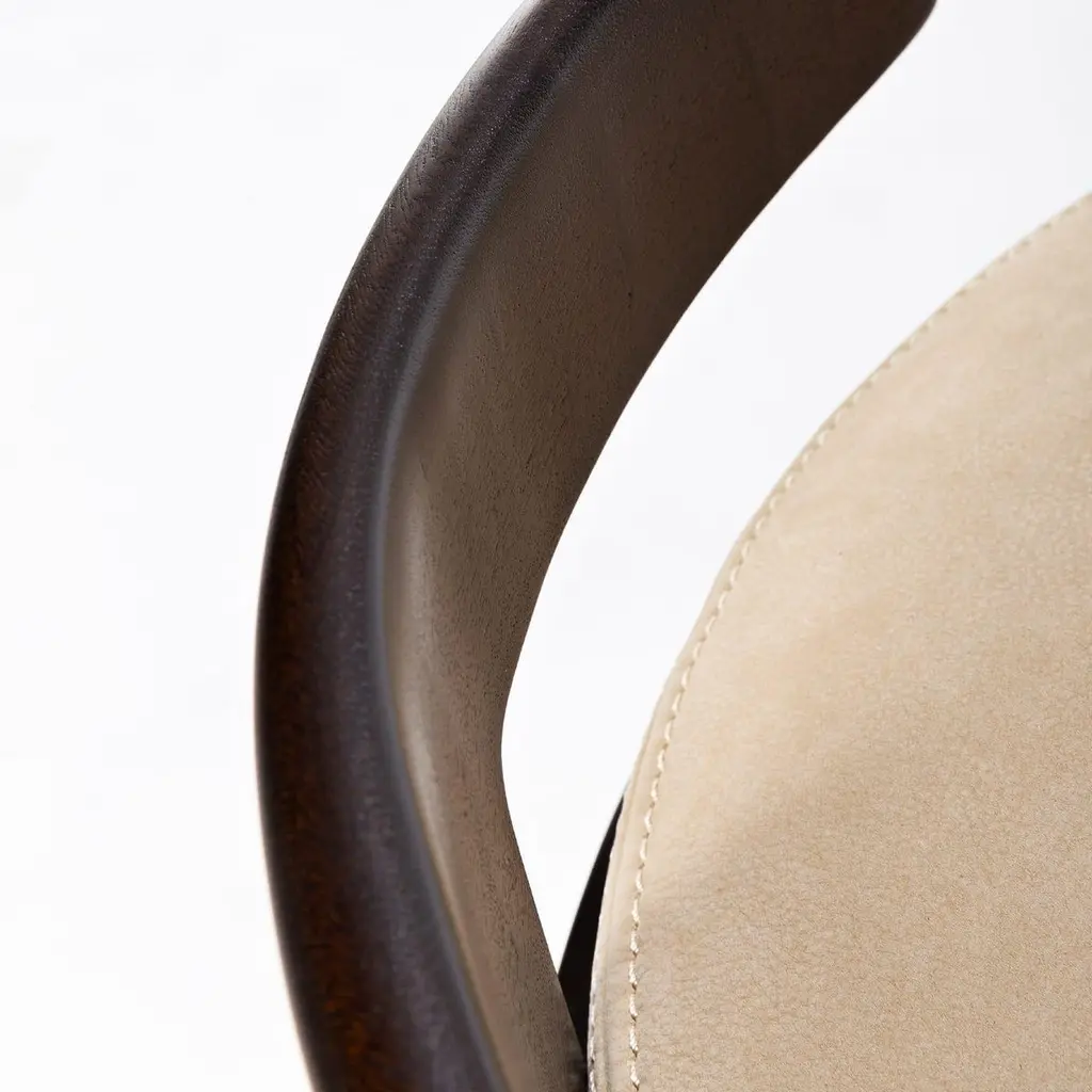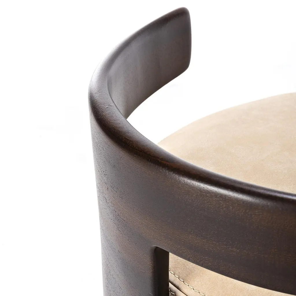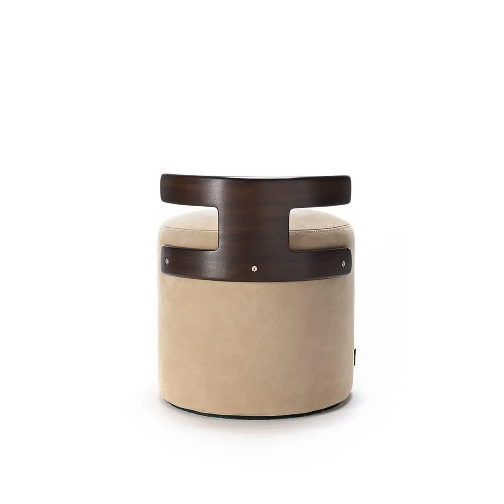 A softly padded cylindrical seat makes up the gorgeous design of this innovative pouf by Massimo Castagna, supported with a sleek mahogany backrest boasting a striking T shape. Upholstered with beige leather with tone-on-tone stitching, this piece is a contemporary take on a timeless classic. An outdoor cover is recommended to protect the piece when left outside.