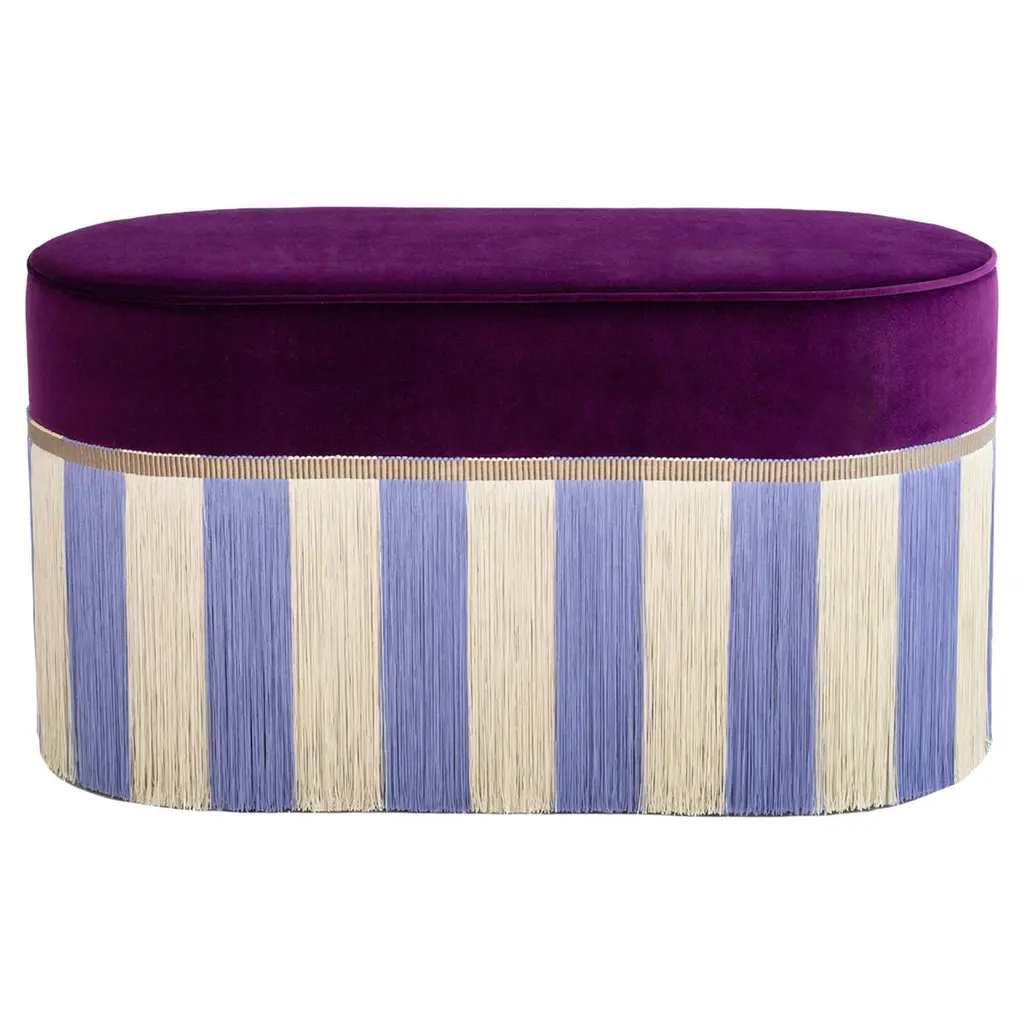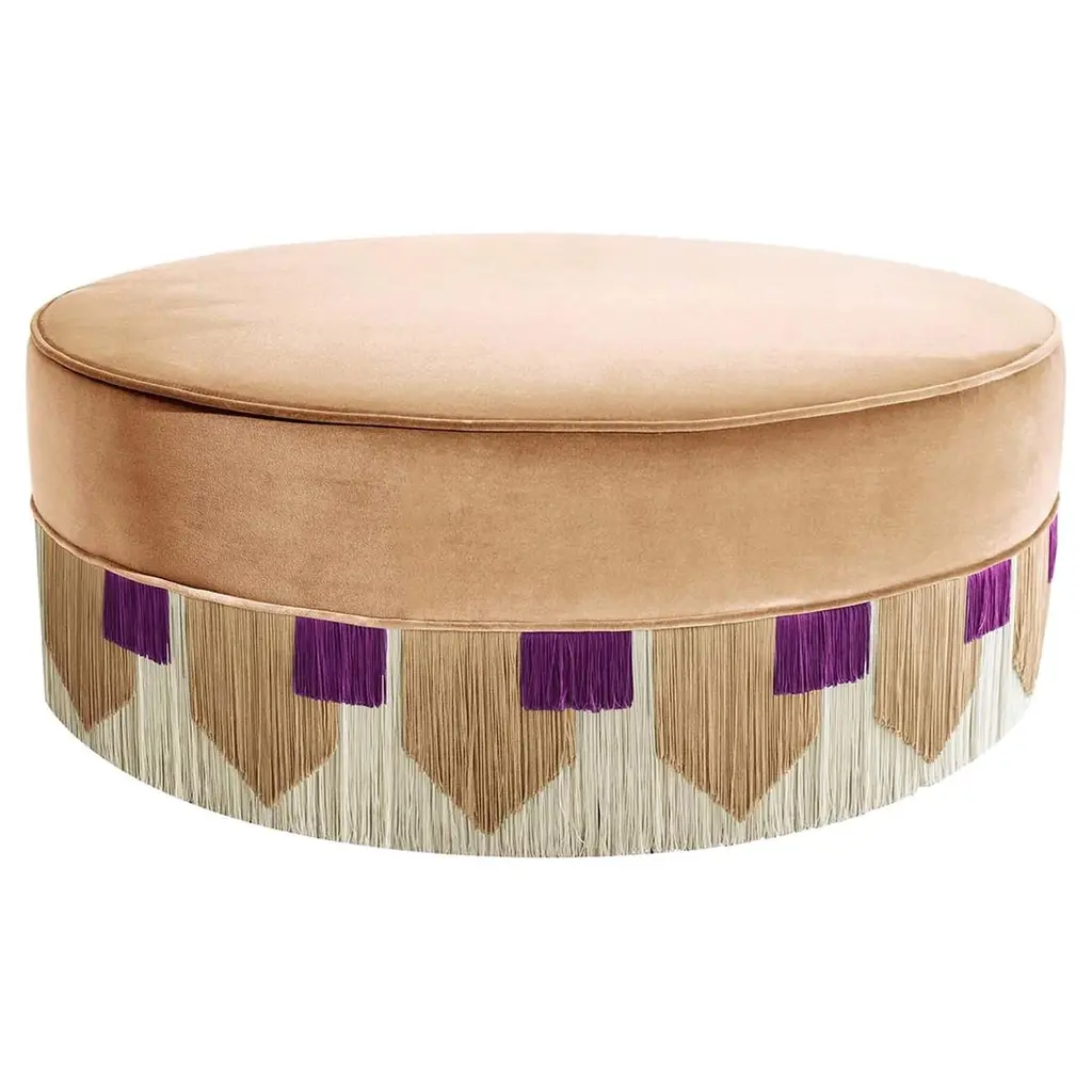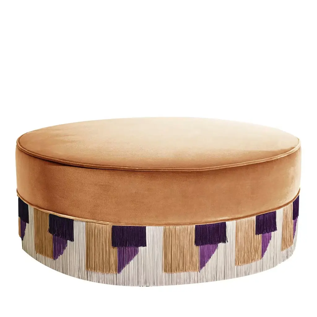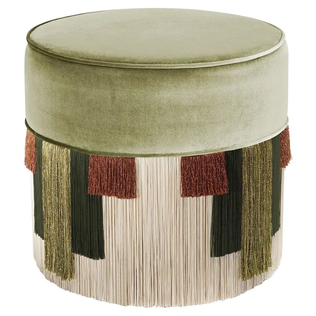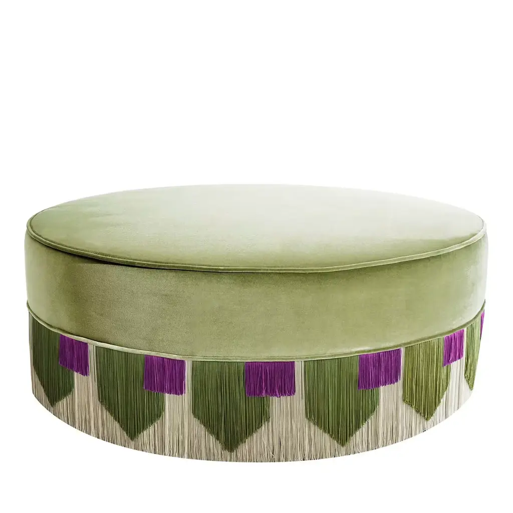 This round classy pouf differs from the rest thanks to the viscose fringes that create a unique and colorful set of tie-like shapes. This product is entirely made in Italy and its base is in painted beech wood while the top has synthetical padding fully upholstered in premium light-green velvet.
