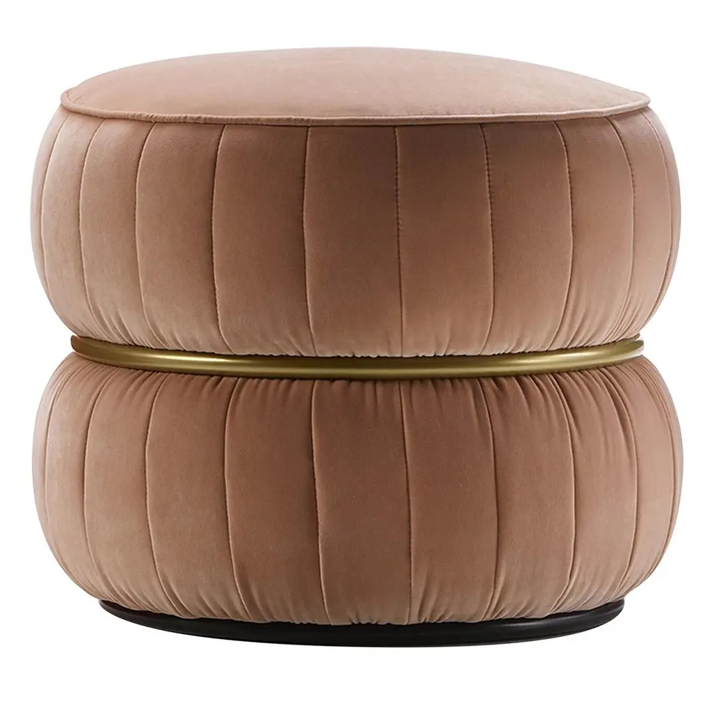 A synthesis of the perfect blend of function and aesthetic, this pouf features an elegant and refined style that will effortlessly complement any interior decor. Resting on a multi-layered poplar wood structure padded with high-resilience, multi-density polyurethane foam, it is enriched with a matte gold-finished metal ring enhancing the softness of the two cushions' non-removable fabric upholstery finished with precious ribbed stitching.