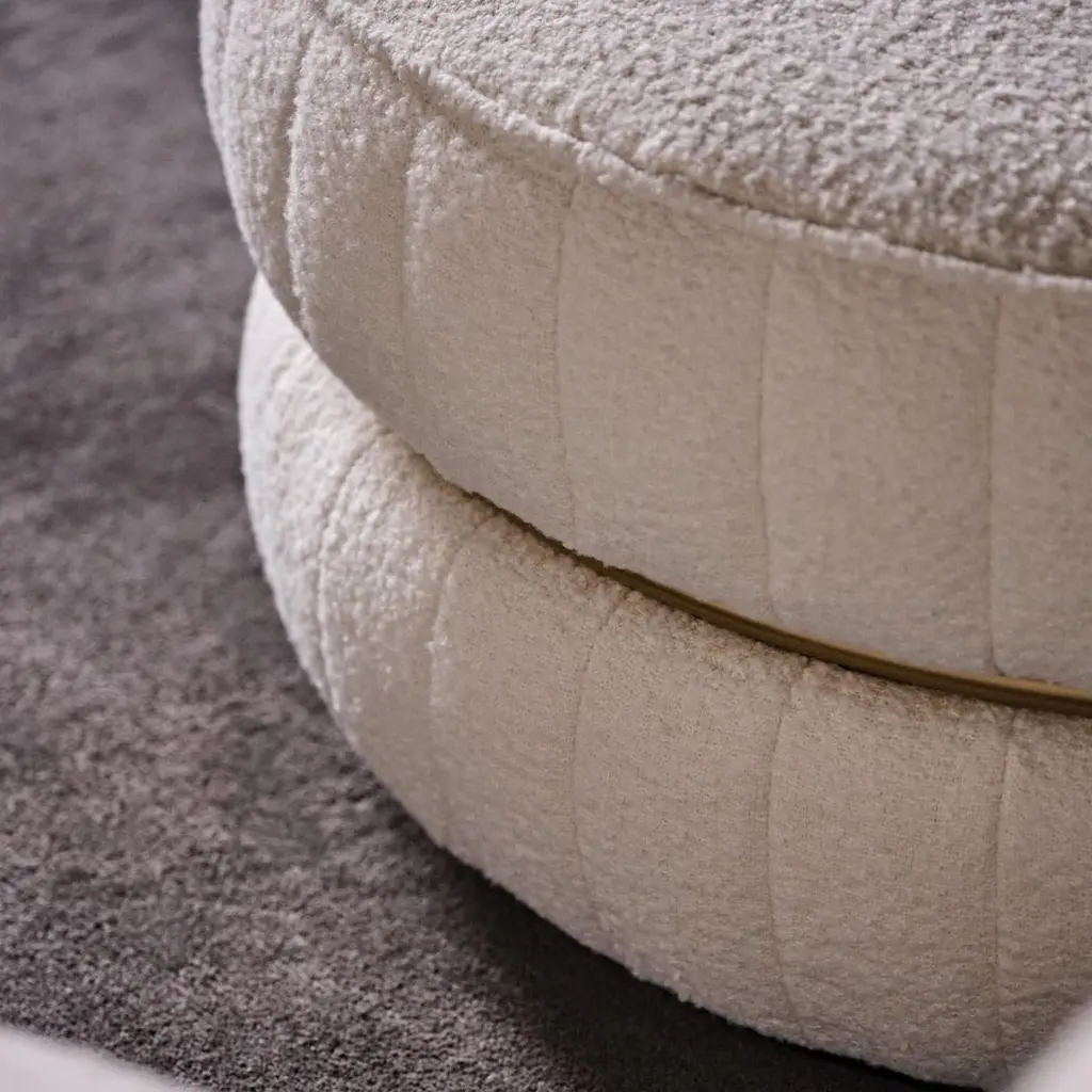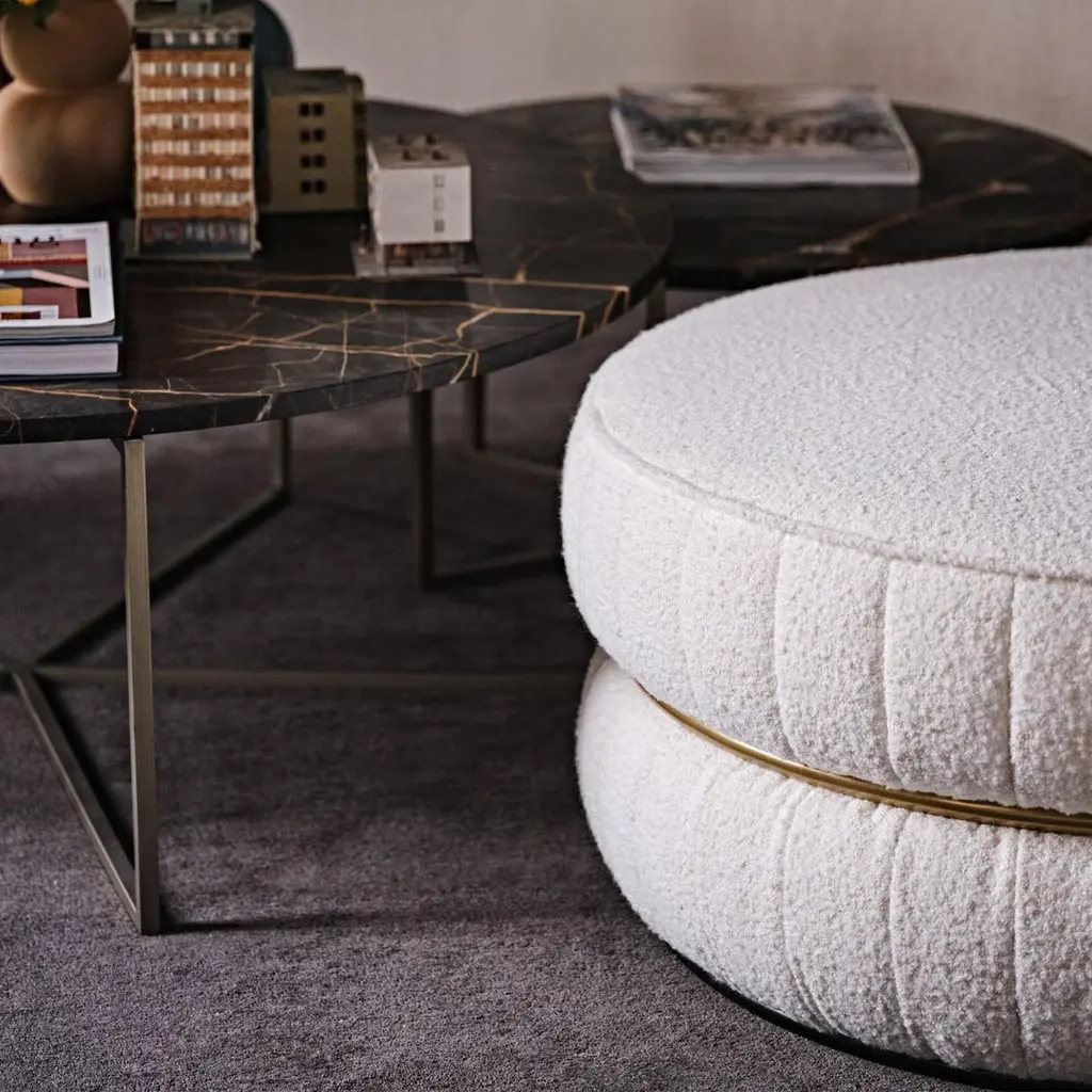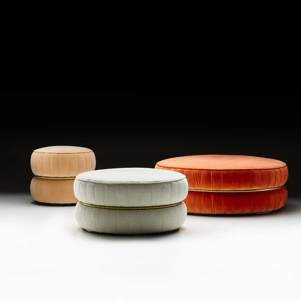 An elegant combination of function and aesthetic, this pouf exudes a timeless and versatile charm. Enriched with a matte gold-finished metal ring enhancing the softness of the non-removable fabric upholstery finished with precious ribbed stitching, it rests on a multi-layered poplar wood structure padded with high-resilience, multi-density polyurethane foam.
