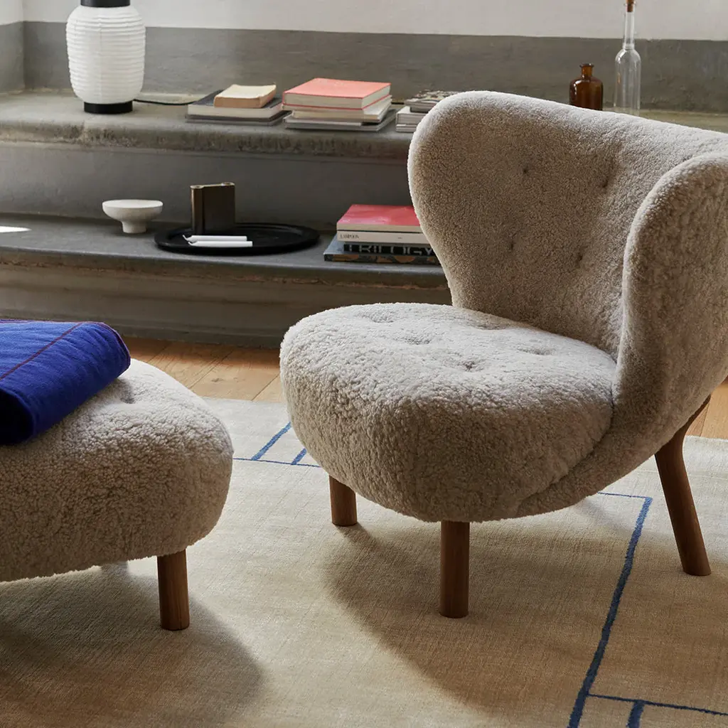 Soft and nurturing, the Pouf is an ideal companion. With rounded legs in either oak walnut, and upholstery in a wide variety of fabrics that include sheepskin, it lends an organic warmth to any interior. Pair with the Little Petra for an elegant lounge seating arrangement.