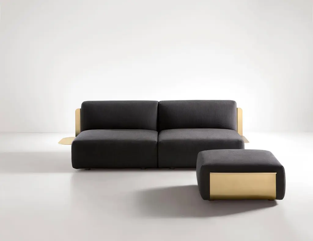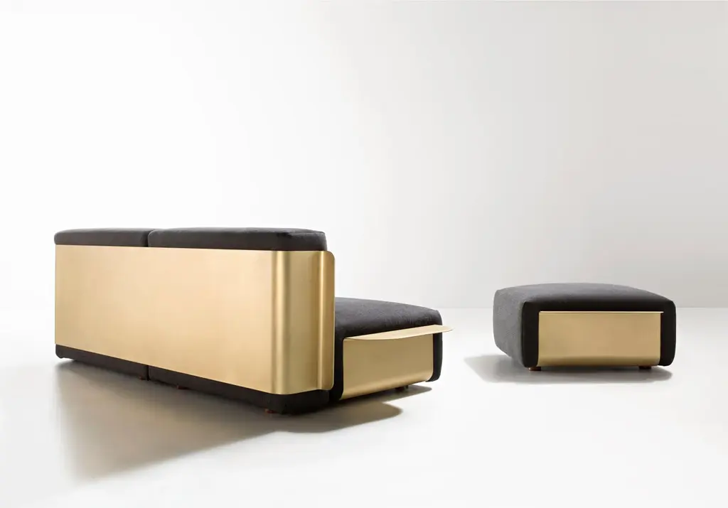Loom Pouf by De CastelliDimensions: W 91 x D 75 x H 40 cmMaterials: Orbitale DeLabré Brass, FabricOther versions are available, please contact us for any request.The Loom collection challenges the apparent contradiction between the hardness of metal and the soft comfort of upholstery. Loom turns an oxymoron into inspiration, positioning a welcoming, familiar form atop a brass clip that embraces as it holds the cushions in place, defining its very shape. Loom embodies the De Castelli approach to the world of upholstery: while respecting the comfort of the ample seat, metal remains the star, truly shining in its role as supporting arms that gently rise up at the sides.DE CASTELLI“HARD COUTURE”Faithful to its decision to reinstate the special role of metal in design and experimentation, De Castelli infuses artisan ideas and workmanship into industrial processes, leading to entirely original results. The encounter with design inspires an approach to materials founded upon respect for their potential, be it hidden or obvious, which emerges slowly in a collection of pieces that, despite being part of a series, remain unique.Unique not only for the hand that has created them, but also for the singular cultural path that focuses on the aesthetic (and not just practical) value of the primordial material with which De Castelli shapes living spaces.A BESPOKE APPROACHEach object, even in the repetition of form, is a creative act in and of itself, one that incorporates a heritage of constantly-evolving expertise and research. The equation that relegates ‘cold’ metals to the margins of furnishing projects is thus overturned, bringing iron, brass and copper, in their infinite variations and finishes, to the centre of an entirely renewed stage, allowing them to finally shine with their own light.SUSTAINABILITYDe Castelli has always been committed to making the entire production cycle increasingly sustainable, aware that metal, the material with which its business identifies itself, is precious and must be treated with care, without waste.PEOPLE FIRSTThe wide spaces of the De Castelli headquarters in Crocetta del Montello (TV) allow those who work to enjoy environments where order, cleanliness and safety are always maintained and guaranteed. An attitude of attention and respect for people that has led to the shared ethical code.